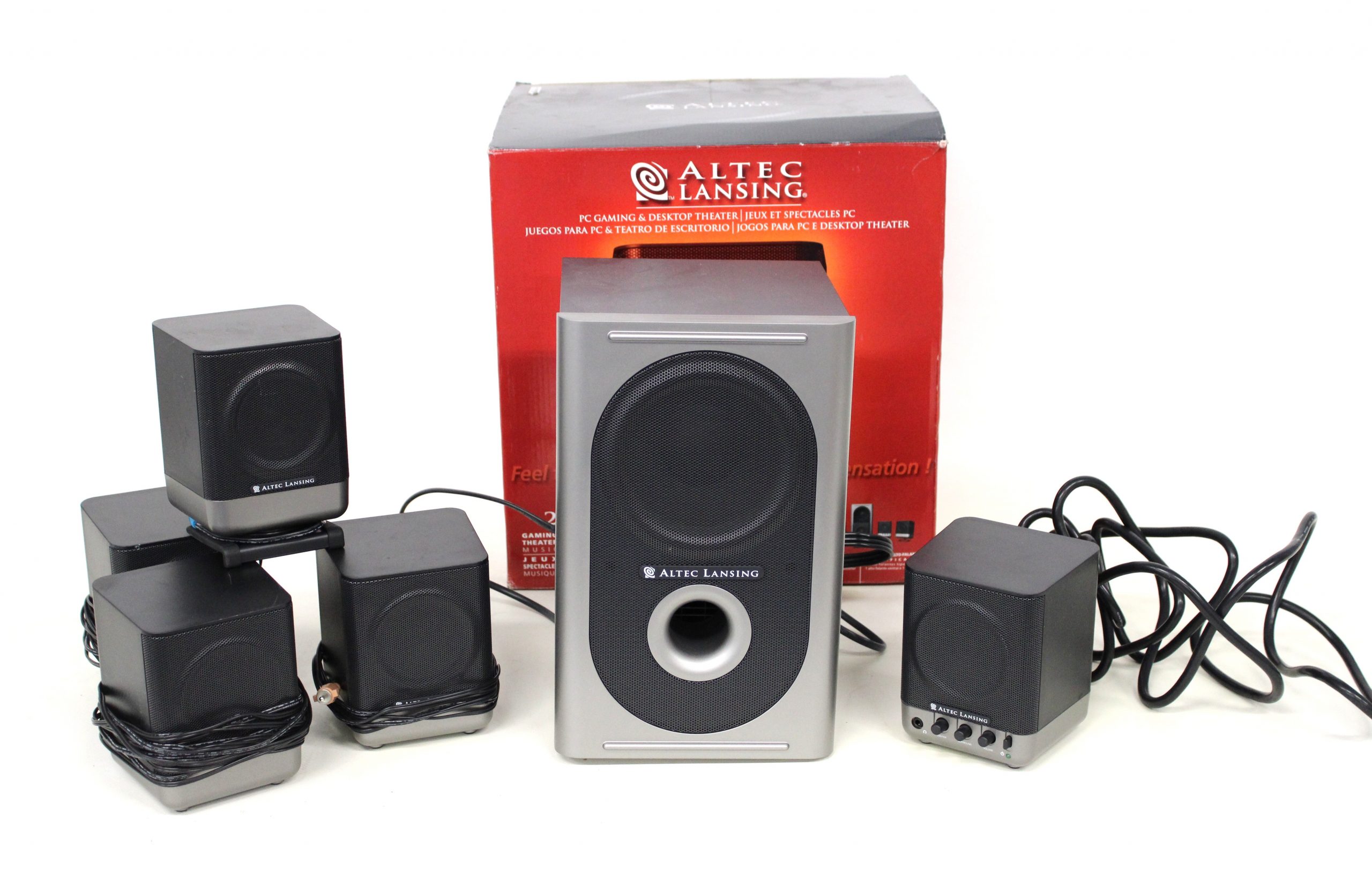 Sistema de altavoces Altec Lansing 2.1, que incluye un subwoofer central y dos altavoces satélite más pequeños. Modelo Altec Lansing 2.1. Subwoofer (central) y dos altavoces satélite. Diseñado para ordenadores (PC).