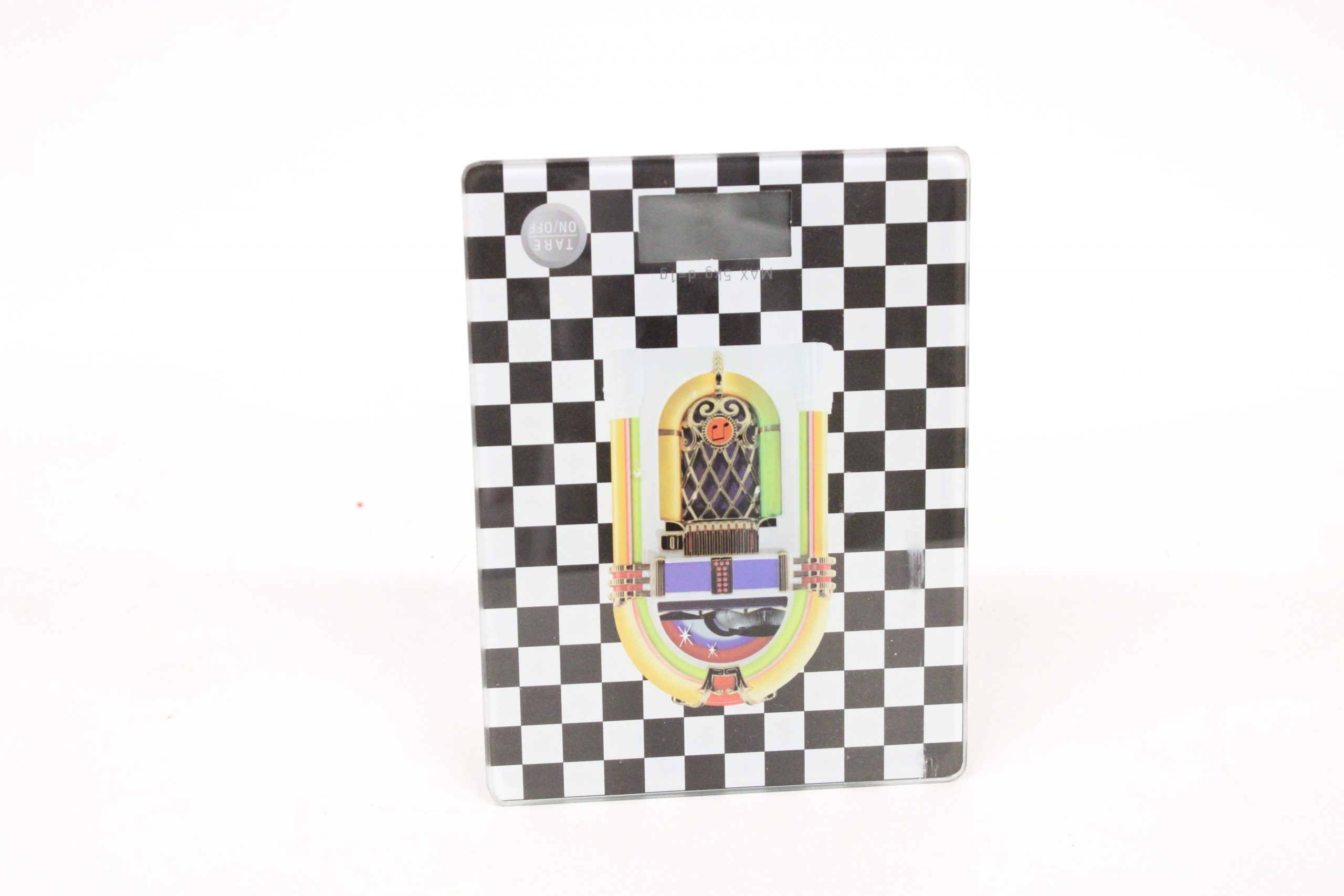 Bascula de cocina con un diseño de una maquina de discos antigua