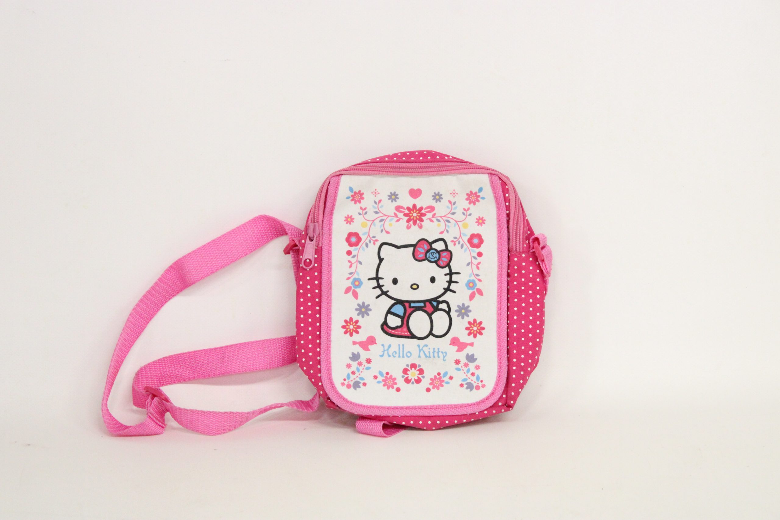 Bolso bandolera Hello Kitty, ideal para salir de paseo. Es un bolso de color rosa con estampado de lunares y flores. Bolso bandolera pequeño. Asa de hombro regulable. Cierre de cremallera.