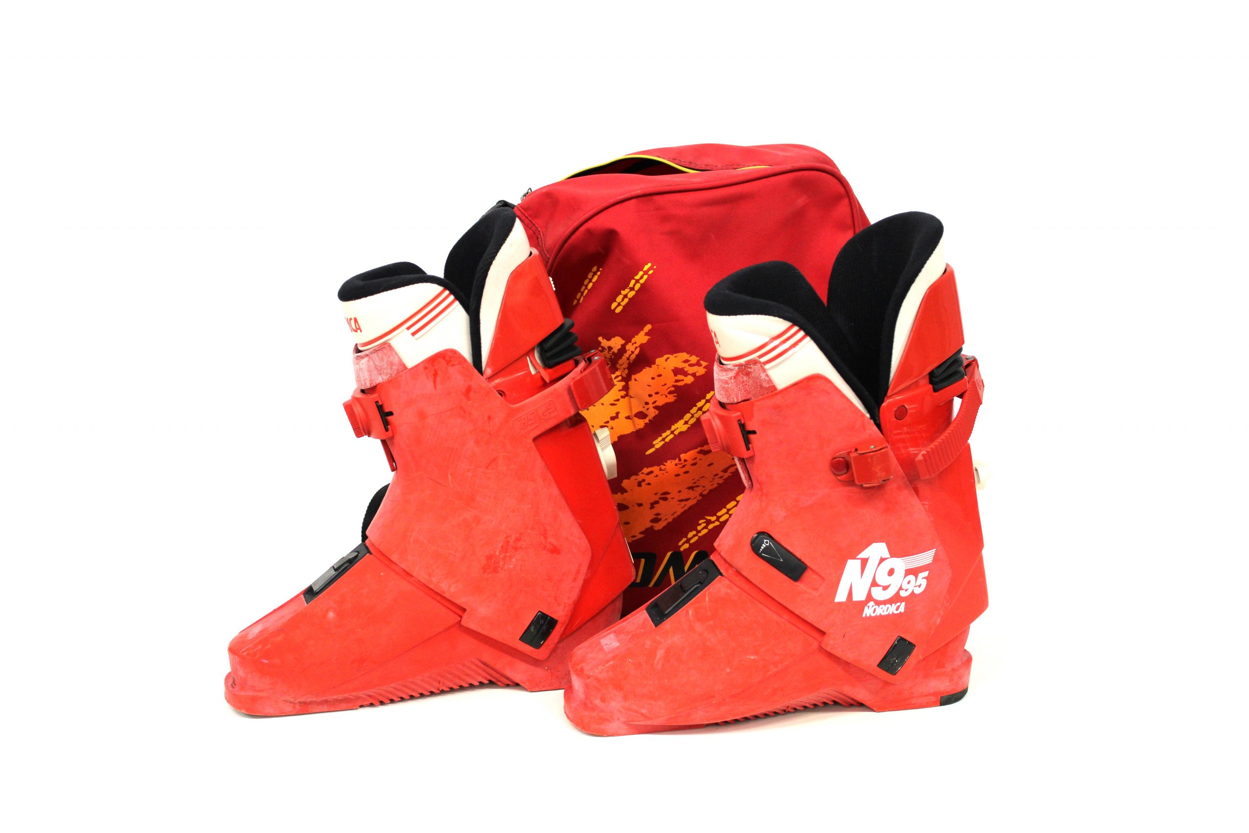 Botas de esquí de adulto modelo Nórdica n995 de la marca Salomon  junto con su bolsa para transportarlas en color rojo