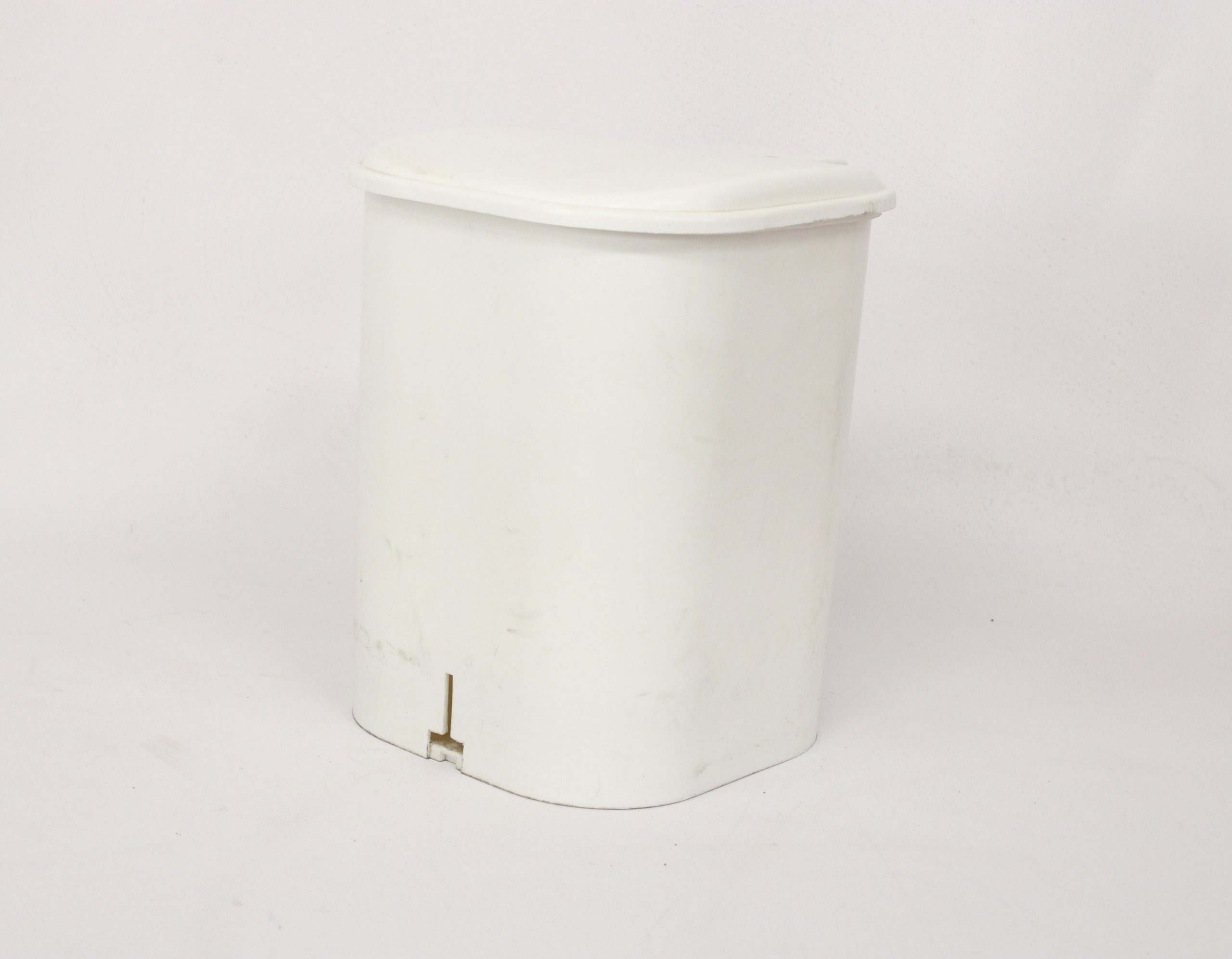 Cubo de basura compacto, diseñado para el baño o la cocina. Cubo de basura con pedal. Generalmente plástico duradero en color blanco.