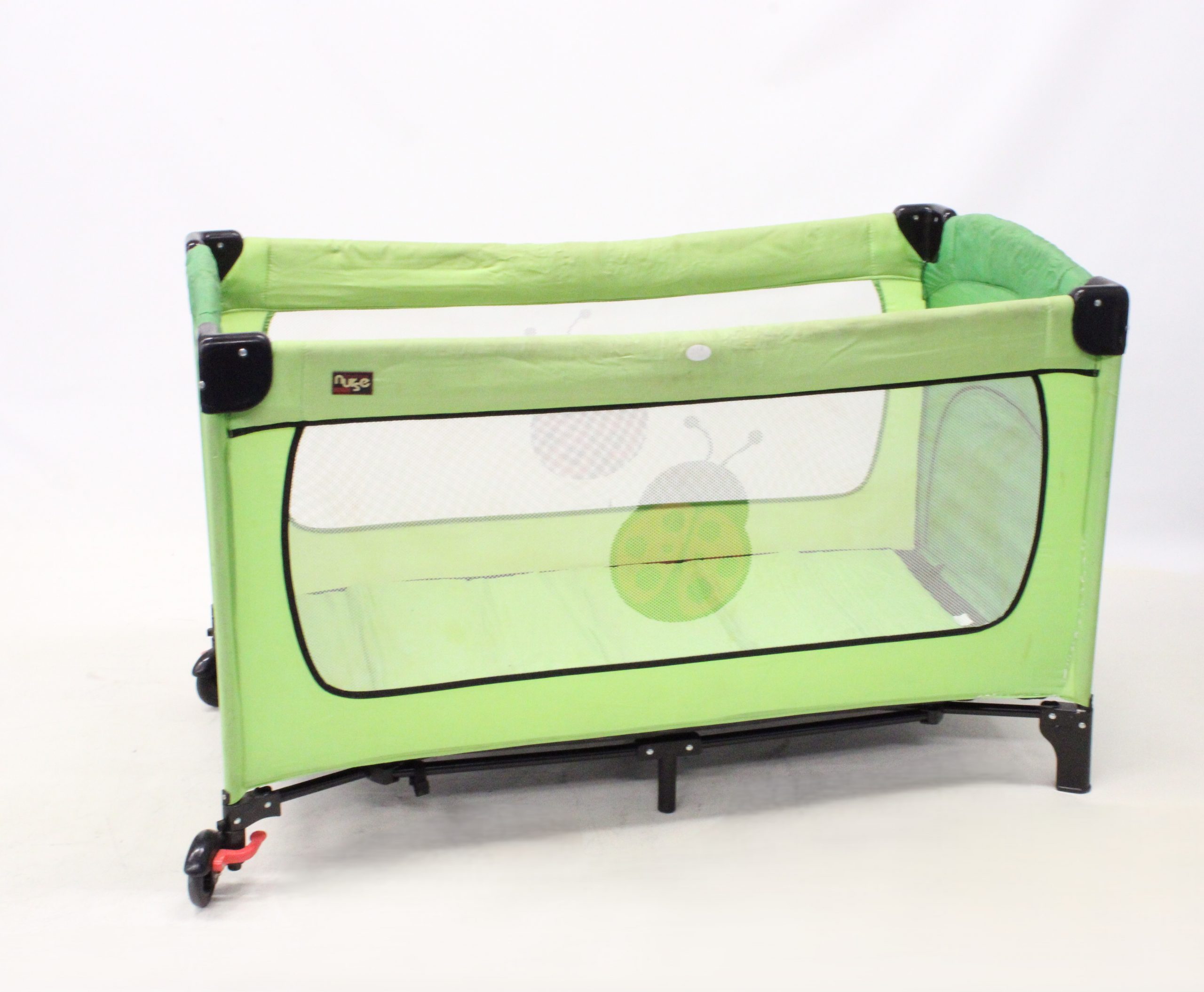 Cuna de viaje portatil de la marca Nurse que se puede plegar para facilitar el transporte y almacenamiento en color verde y marron