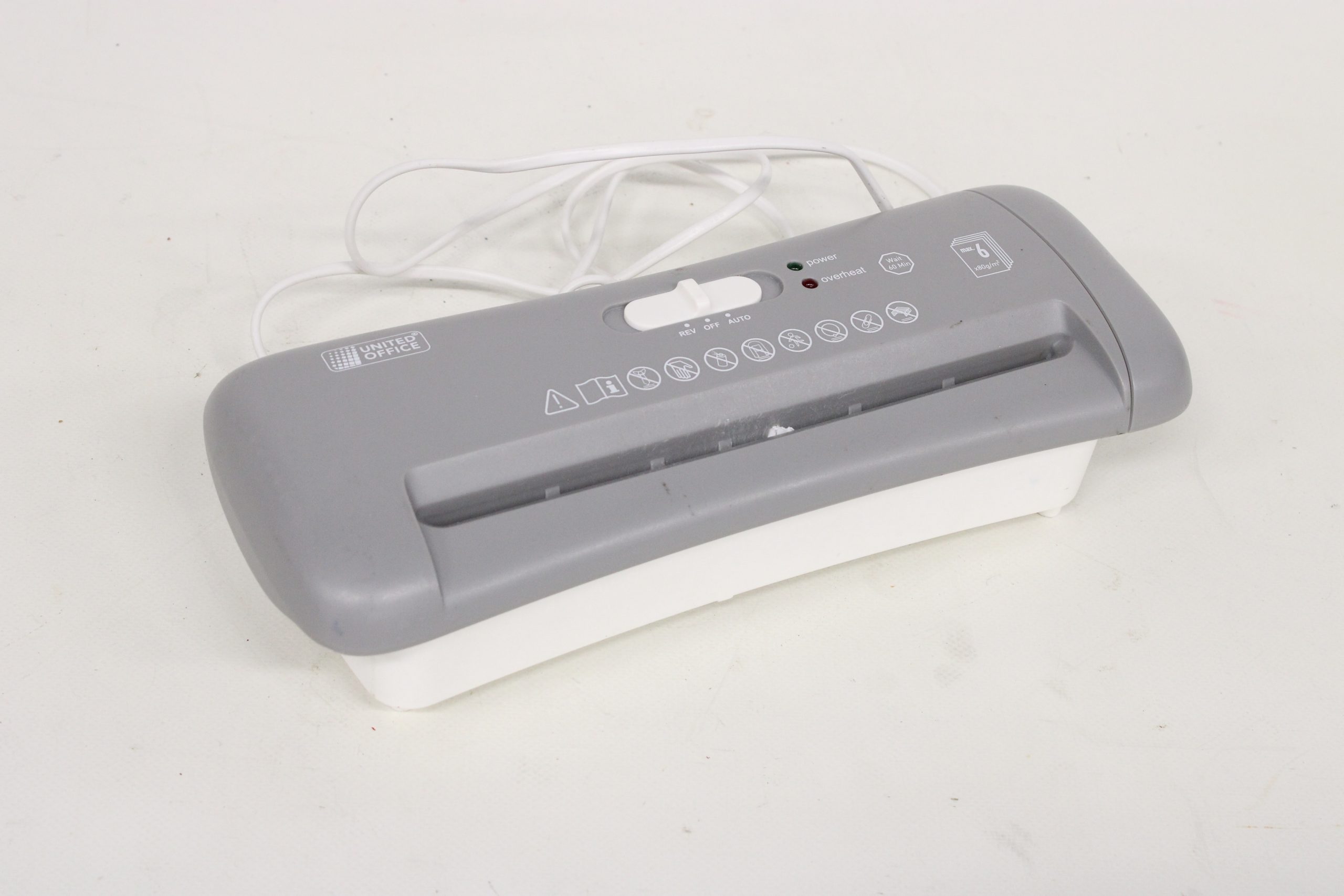 Destructora de documentos United Office, modelo UAV 190 B2. Capacidad para triturar hasta 5 o 6 hojas de papel A4 simultáneamente. Cuenta con función de retroceso y apagado automático por sobrecalentamiento. Es un dispositivo eléctrico diseñado para uso doméstico o de oficina.