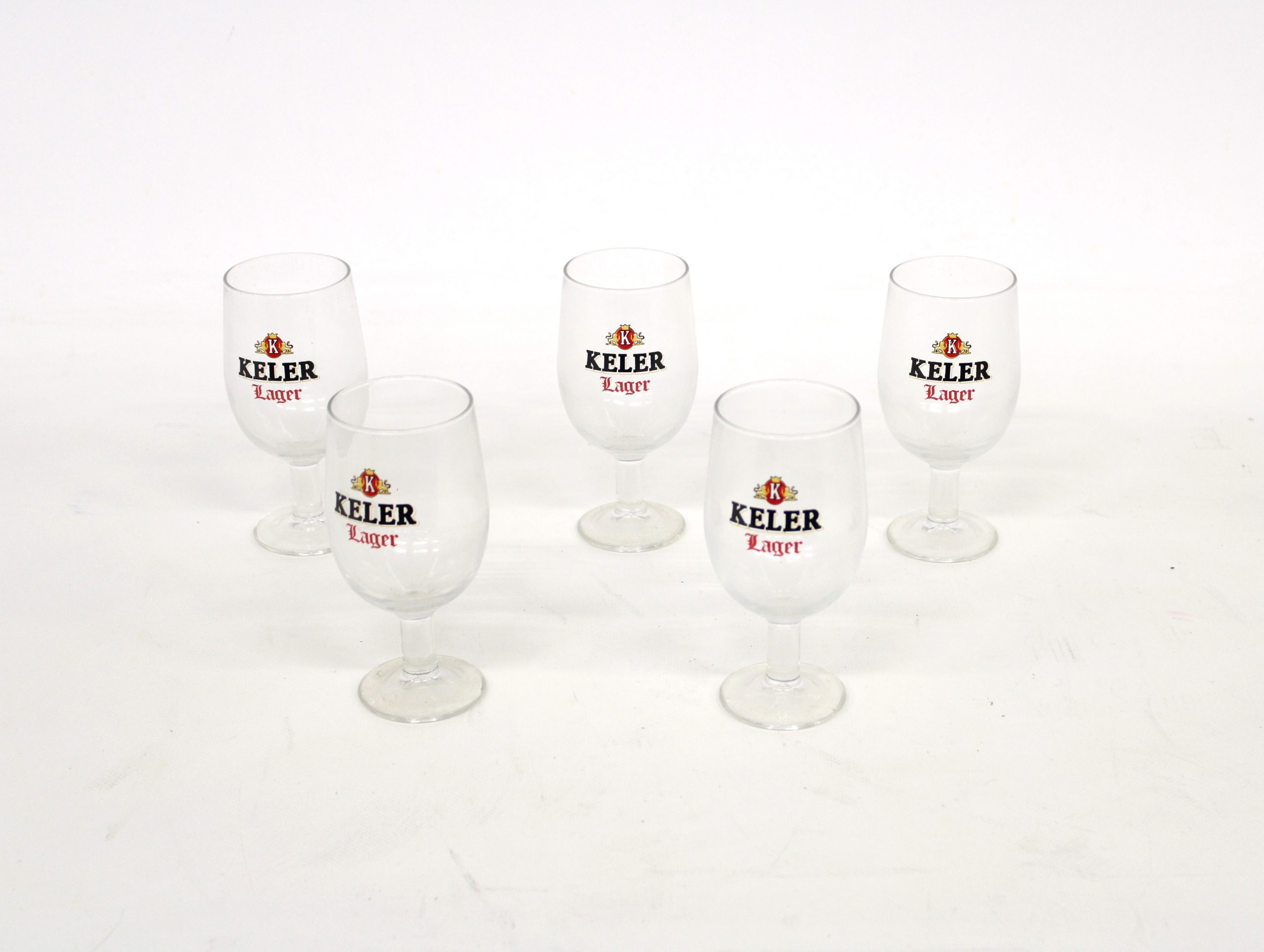 Juego de cinco copas de cerveza con logo de publicidad Keler.