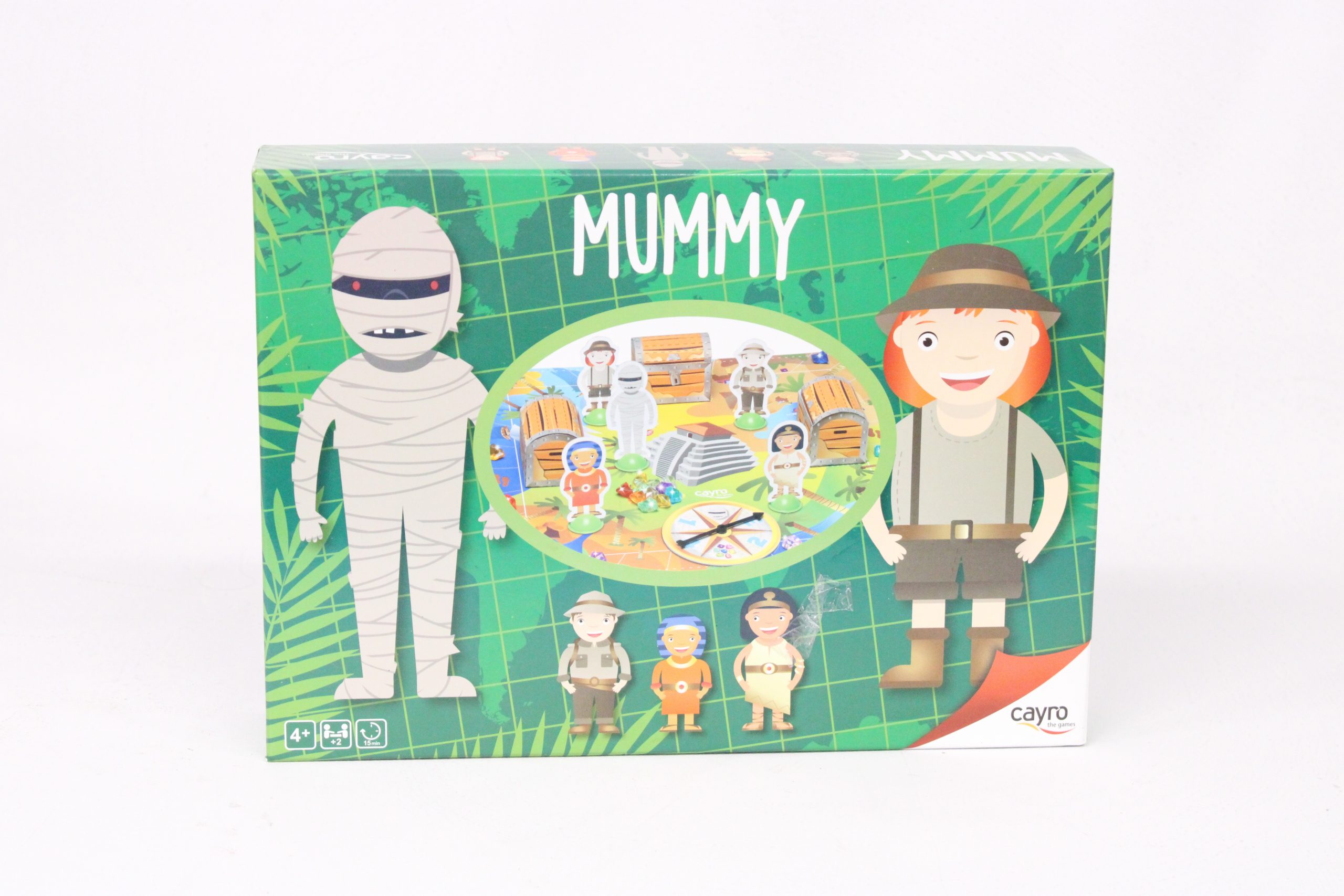 Juego de mesa Mummy. En el antiguo Egipto los más valientes exploradores van en busca del tesoro de la momia, el explorador que más tesoros consiga será el ganador, ¡pero cuidado!, el fantasma de la momia está presente y puede quitarte parte del tesoro. Edad recomendada: 4+.