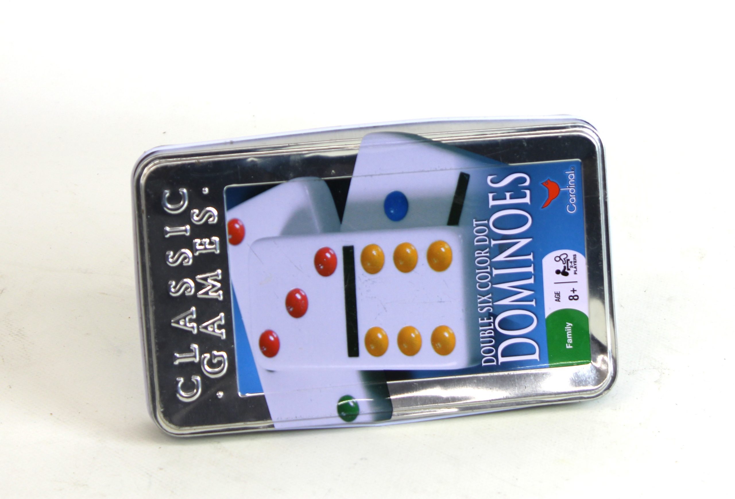 Juego de domino Double Six Color Dot Dominoes de la marca Cardinal, incluye 28 fichas duraderas con puntos de colores brillantes en lugar de los puntos negros tradicionales, viene en una caja metalica compacta y reutilizable para un facil almacenamiento y transporte.
