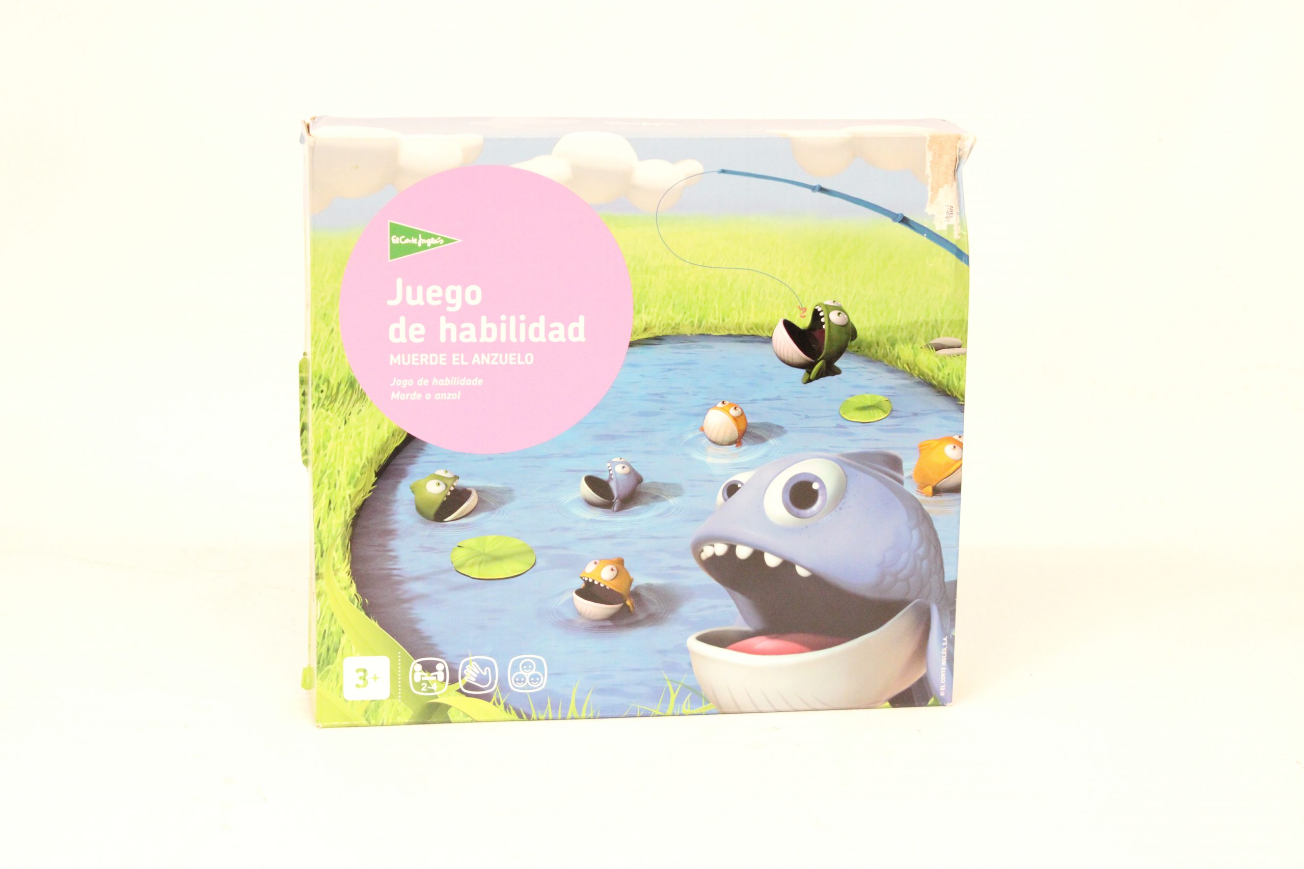 Juego de habilidad Muerde el anzuelo de El Corte Inglés. Diseñado para 2 a 4 jugadores. Los participantes lanzan la caña para pescar peces del mismo color que su caña. El objetivo es ser el primero en sacar todos los peces y el pez negro. Incluye un estanque giratorio que añade un desafío adicional.