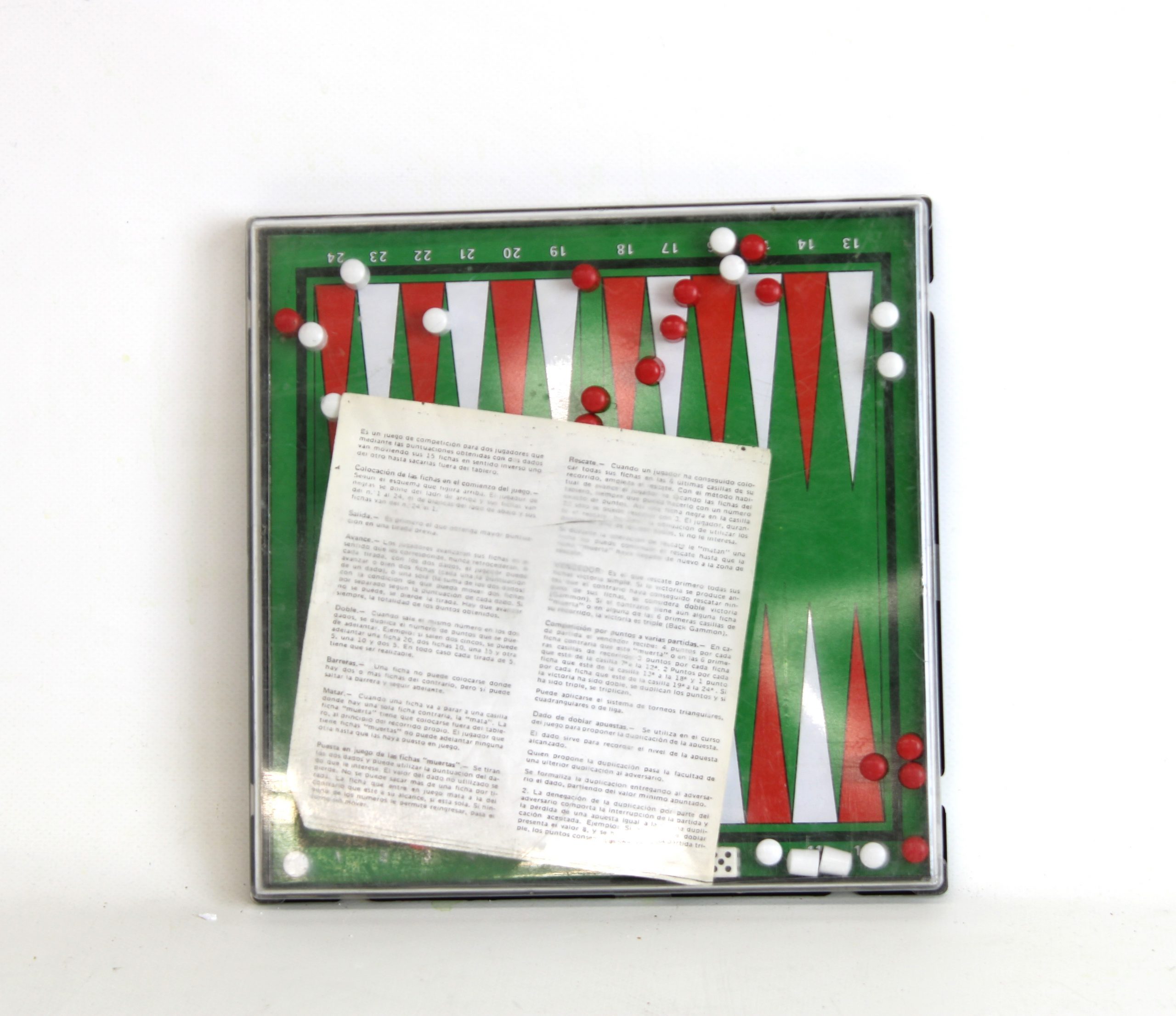Juego de mesa de backgammon, uno de los juegos de mesa más antiguos conocidos, que combina azar con estrategia. Es un juego para dos jugadores que utilizan fichas y dados en un tablero con 24 triángulos estrechos. El objetivo es mover todas las fichas propias alrededor del tablero y sacarlas antes que el oponente.