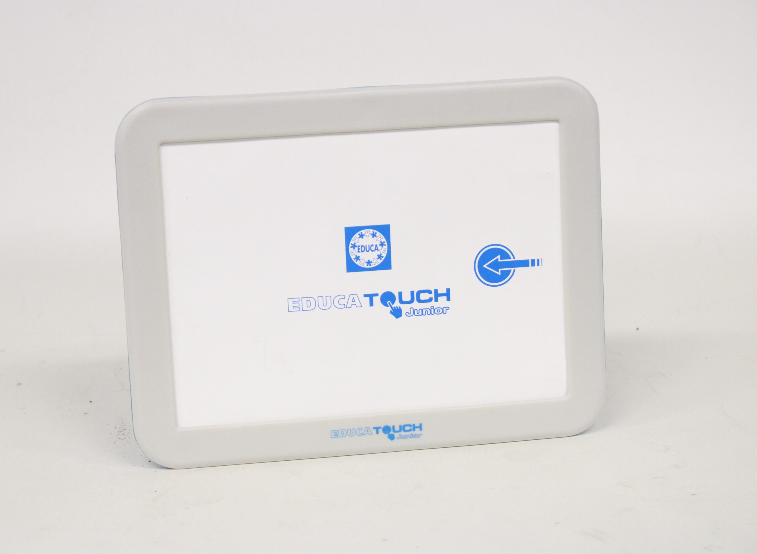 Juguete educativo electrónico Educa Touch Junior de la marca Educa Borras. Es un panel interactivo con marco gris y superficie táctil blanca, diseñado para niños. Utiliza láminas intercambiables que se colocan sobre la base para activar diferentes actividades educativas. Incluye modos de juego como cuentacuentos, exploración y preguntas, acompañados de voz, canciones y sonidos. Estimula el aprendizaje de vocabulario, letras, el cuerpo humano o cuentos, fomentando la escucha activa y la comprensión verbal.