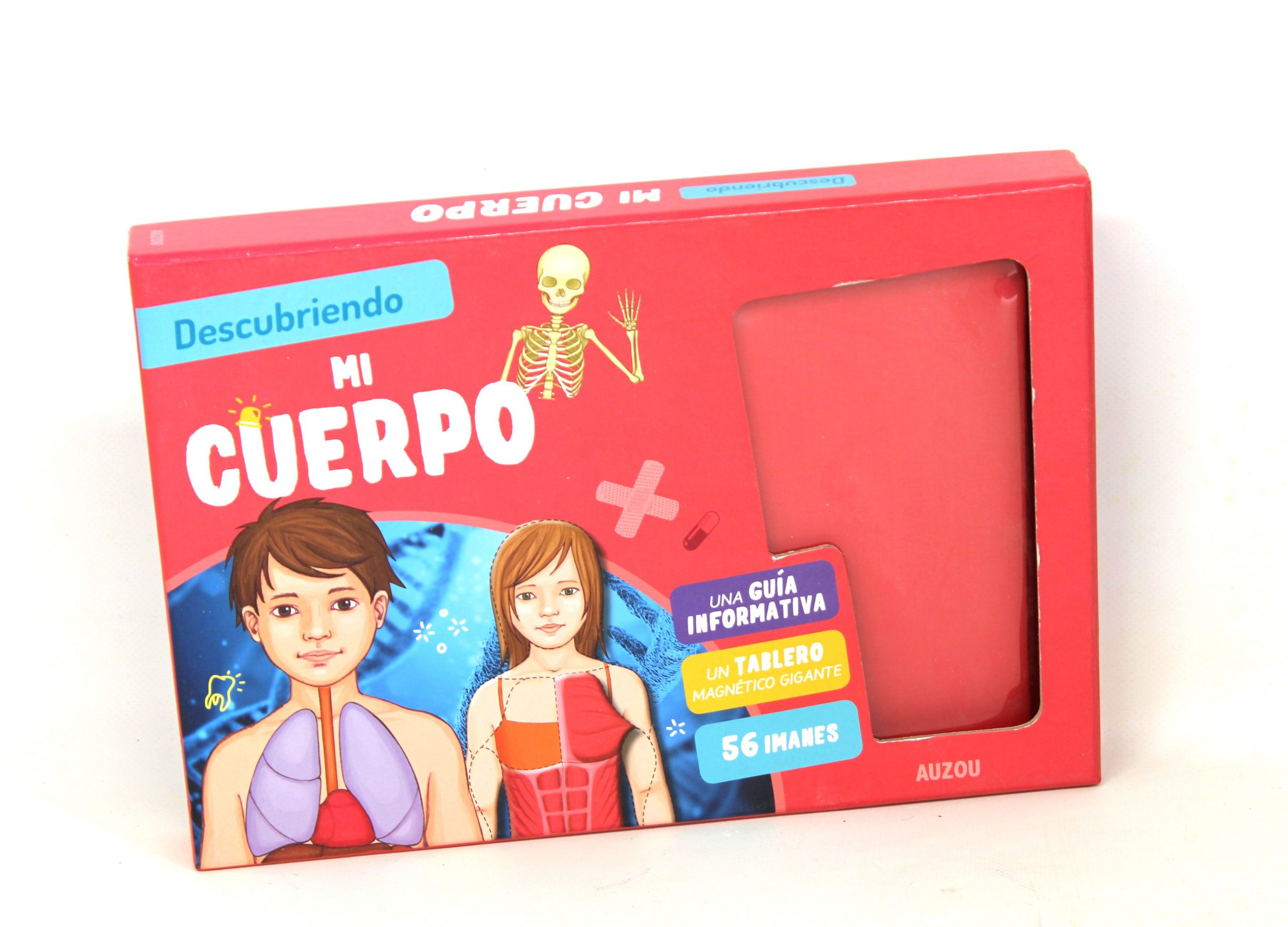 Juego educativo Descubrimiendo Mi Cuerpo de la marca Auzou, libro con 64 ilustraciones,tablero magnetico gigante y 56 imanes para armar los distintos sistemas del cuerpo, diseñado para que los niños aprendan de forma original y divertida sobre el cuerpo humano