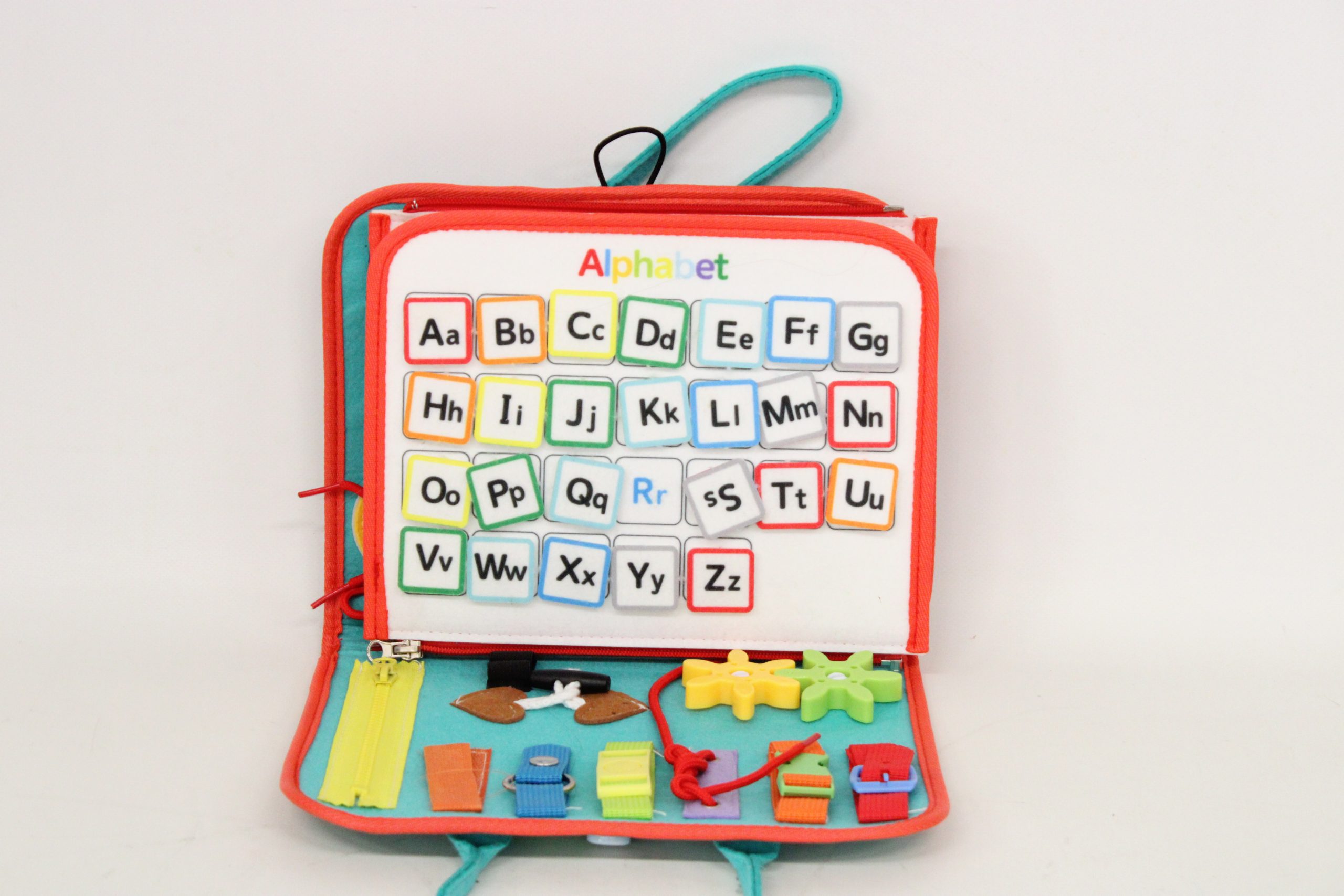 Juguete educativo de tela con el alfabeto móvil, probablemente inspirado en el método Montessori. Es un recurso didáctico diseñado para ayudar a los niños a aprender a leer y escribir mediante la manipulación de letras. Incluye letras mayúsculas de la A a la Z en bloques cuadrados de colores, que se pueden mover y reorganizar. El juguete se pliega en forma de maletín, lo que facilita su transporte y almacenamiento. En la parte inferior, cuenta con elementos adicionales como cordones y formas para practicar habilidades motoras finas.