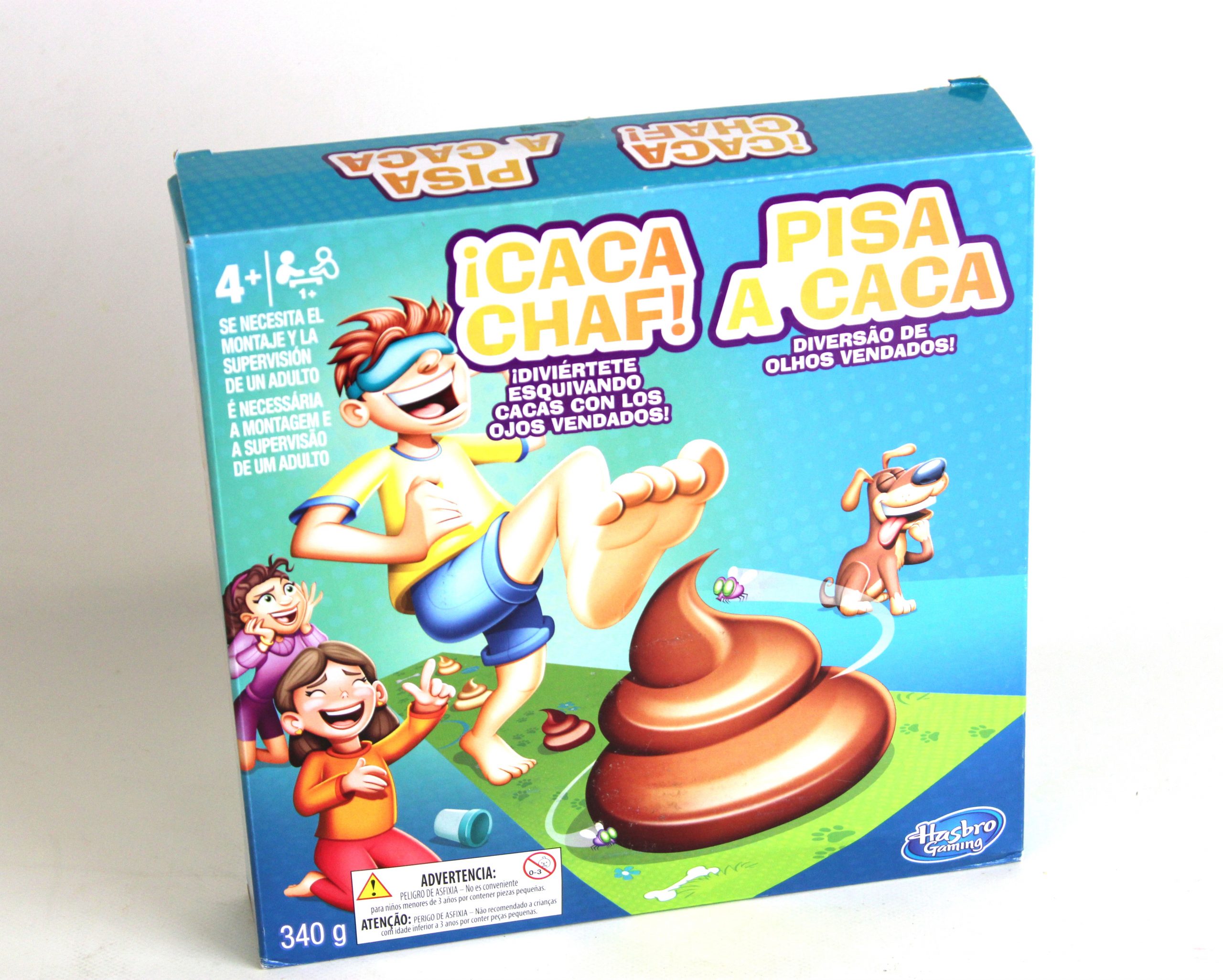 Juego de mesa infantil Caca Chaf de la maraca Hasbro, los jugadoresa intentan no pisar montones de caca de plastilina con los ojos vendados