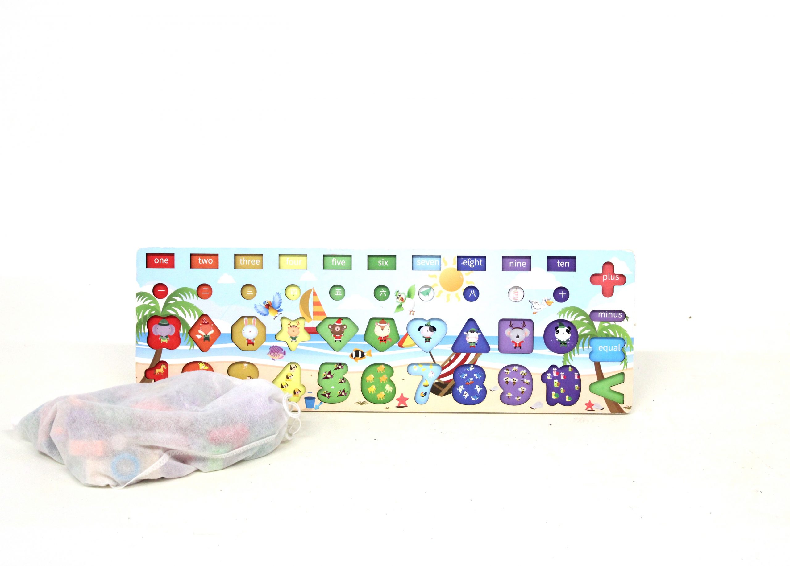 Tablero de rompecabezas de madera de estilo Montessori, diseñado como un juguete educativo para niños pequeños/as. Está fabricado con madera de alta calidad y pintura a base de agua, lo que lo hace seguro y duradero. El tablero combina varias actividades, incluyendo rompecabezas de números, letras y formas, lo que ayuda a desarrollar habilidades cognitivas y de resolución de problemas. Es una herramienta educativa que fomenta el aprendizaje de las matemáticas, el reconocimiento de colores y formas, y la motricidad fina.