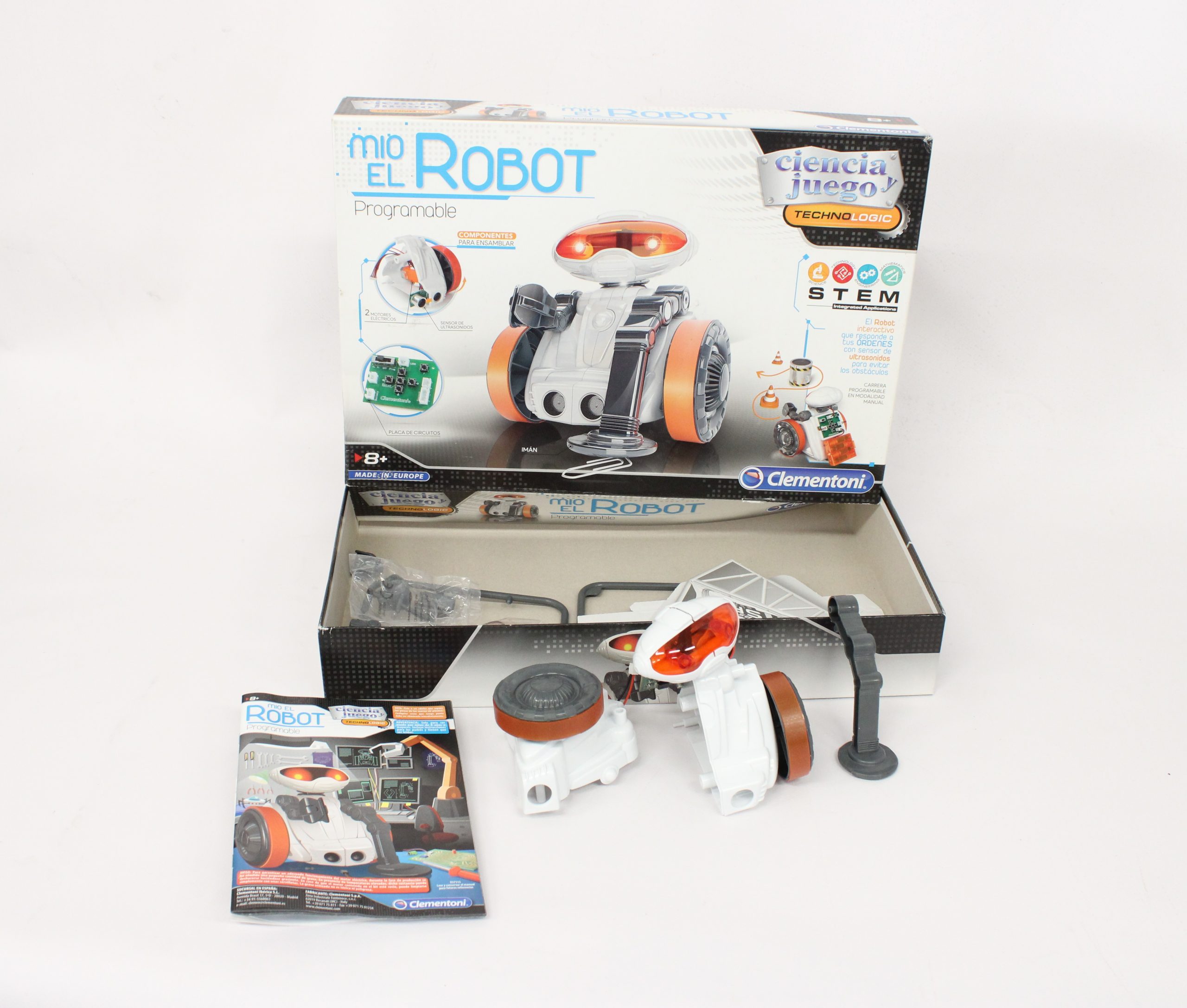 ¡Un kit científico único que te permitirá montar un robot de verdad! ¡Diviértete programando sus movimientos e inventando desafíos alucinantes con tus amigos! ¡Equipado con un innovador sensor ultrasónico, puede detectar objetos a distancia permitiendo al robot esquivar obstáculos en su camino y con el brazo magnético recoger objetos! ¡El kit incluye una gran variedad de componentes intercambiables que te permitirán transformar al robot como quieras y además un manual ilustrado con mucha información sobre electrónica para que te conviertas en un verdadero experto en robots!