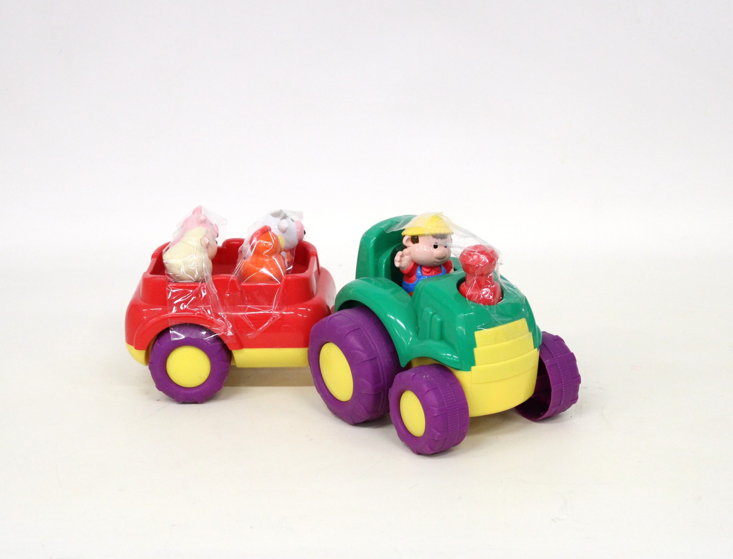 Juguete de la marca Kiddieland, conocido como el “Tractor de la granja con remolque”. El juguete incluye un tractor verde y amarillo con un conductor, y un remolque rojo que transporta figuras de animales. El tractor está diseñado para bebés y niños pequeños, con ruedas grandes y colores brillantes.