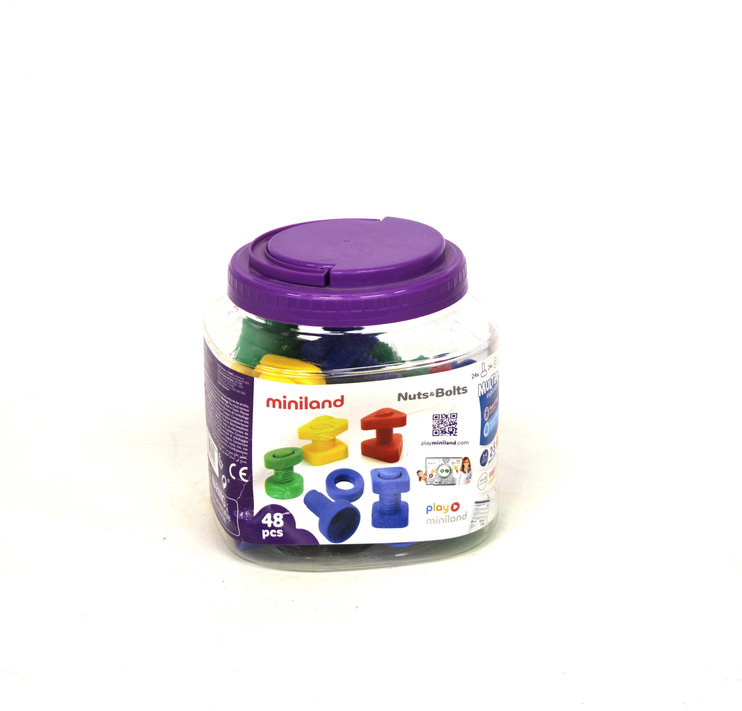 Juego de tornillos y tuercas de plastico de la marca Miniland, las pezas vienen en las tres formas geometricas basicas ;circulo,cuadrado y triangulo, ayuda a desarrollar la destreza manual