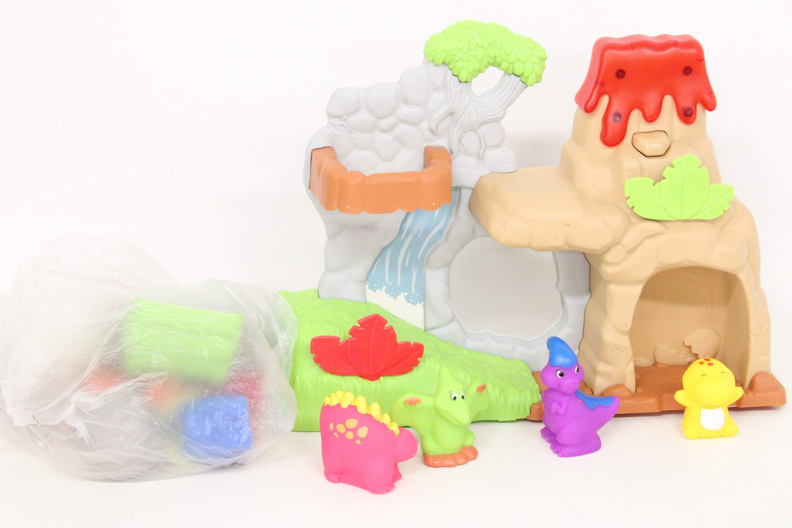 Mira el poderoso volcán rugir y expulsar vapores. Siete amigos prehistóricos, desde el T-Rex hasta el estegosaurio, recorren el vibrante paisaje, listos para batallas épicas y divertidos descubrimientos. Rompe rocas para descubrir tesoros ocultos, lanza rocas en cascada por la ladera con la caída de rocas y compite con dinosaurios por el tobogán de dinosaurios para una emocionante aventura prehistórica. El juego también incluye una imponente montaña de dinosaurios, plantas exuberantes y rocas adicionales.