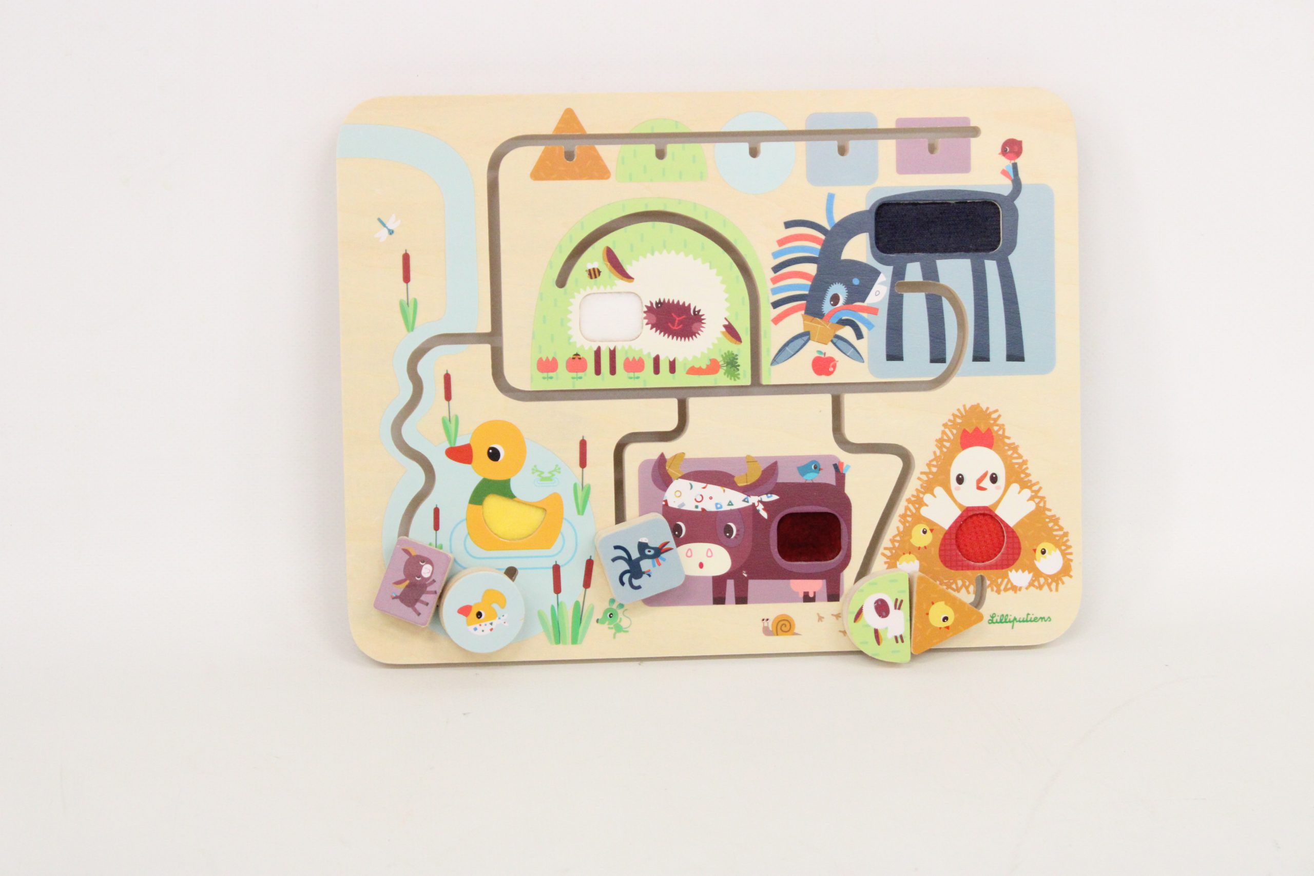 Laberinto sensorial de madera con texturas para asociar animales, de Lilliputiens. El objetivo de este juego es asociar cada bebé de la granja con su mamá o su papá. Para ello, los niños deberán deslizar a los bebés por un recorrido en forma de laberinto. Cada familia tiene un color y forma diferentes, que ayudará a reconocer a los distintos personajes. Además, el cuerpo de cada mamá y papá tiene diferentes texturas que permitirán a los niños desarrollar el sentido del tacto. Este juego es un desafío de lógica y asociación para los más pequeños, con el que también desarrollarán su motricidad fina y comenzarán a conocer las formas y los colores.
