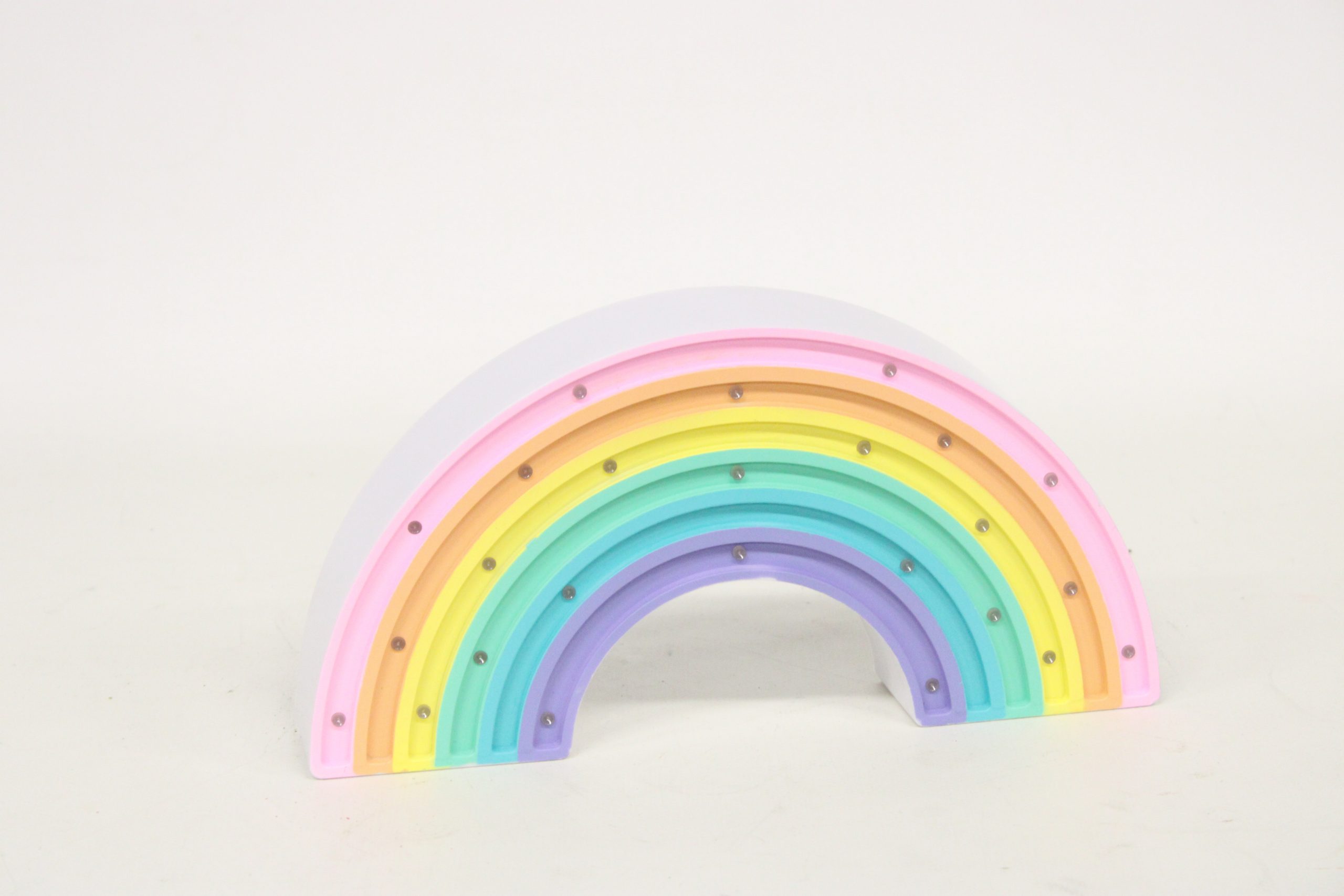 Lámpara es la Little Lights Lámpara Arcoíris, hecha a mano con madera de pino natural y decorada con pintura al agua en colores pastel.