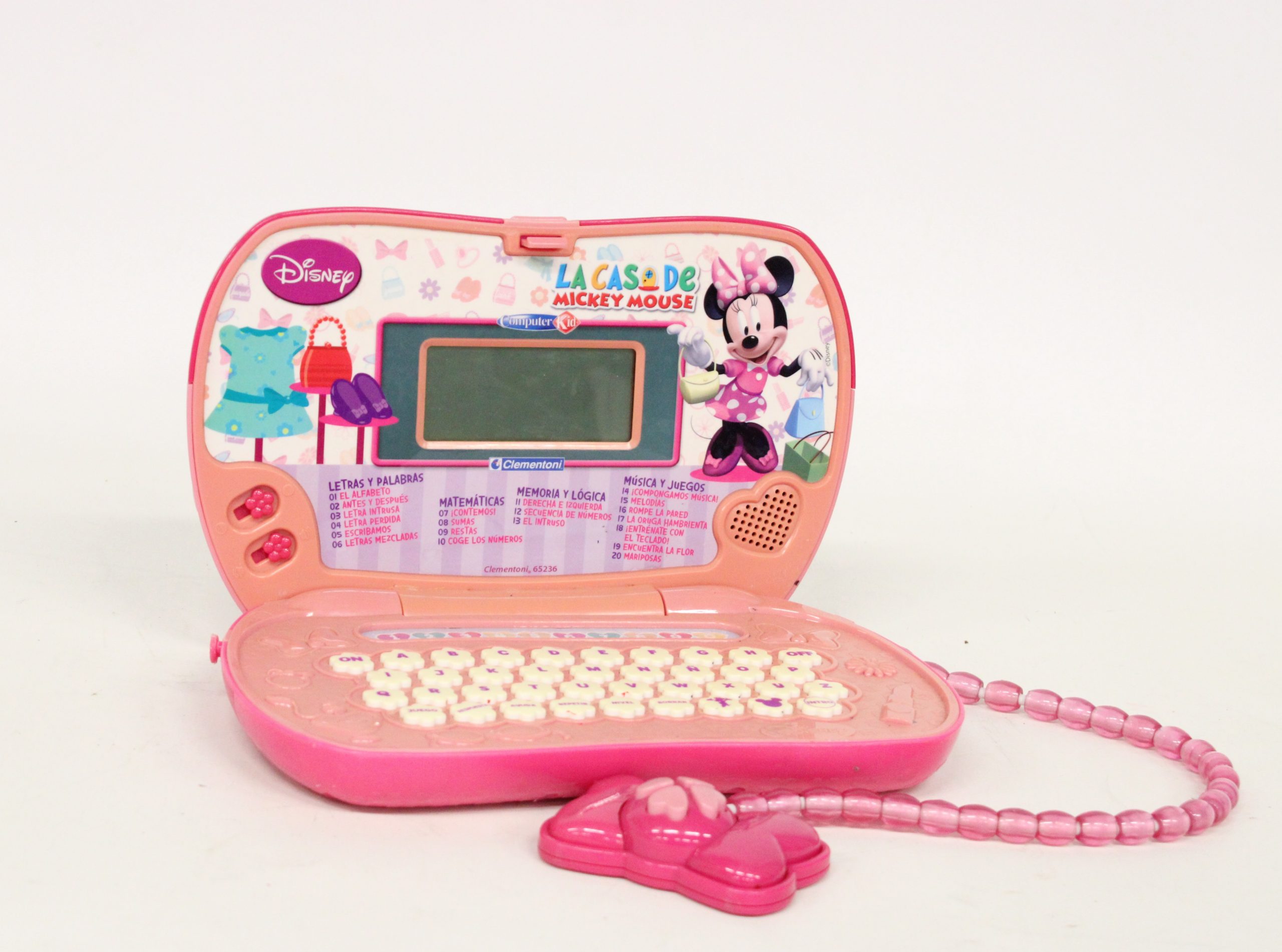 Laptop infantil de juguete de la marca Clementoni con diseño de Minnie Mouse. Cuenta con juegos educativos para aprender letras, números y lógica. Tiene un diseño rosa en forma de bolso con asa para transportarlo fácilmente. Incluye una pantalla pequeña y un teclado.