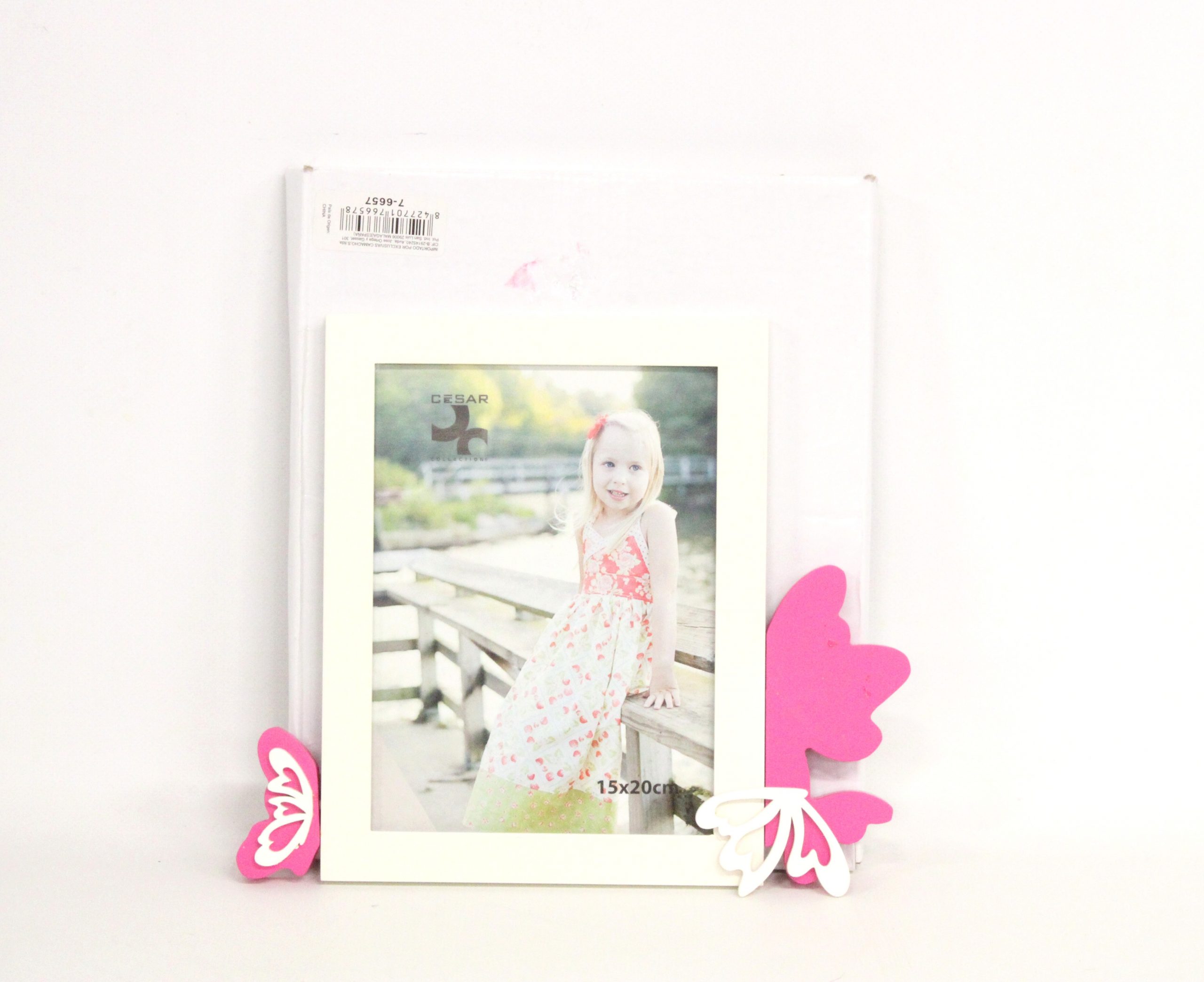 Marco de fotos en color blanco con detalles en rosa. Medida foto: 10x15cm.