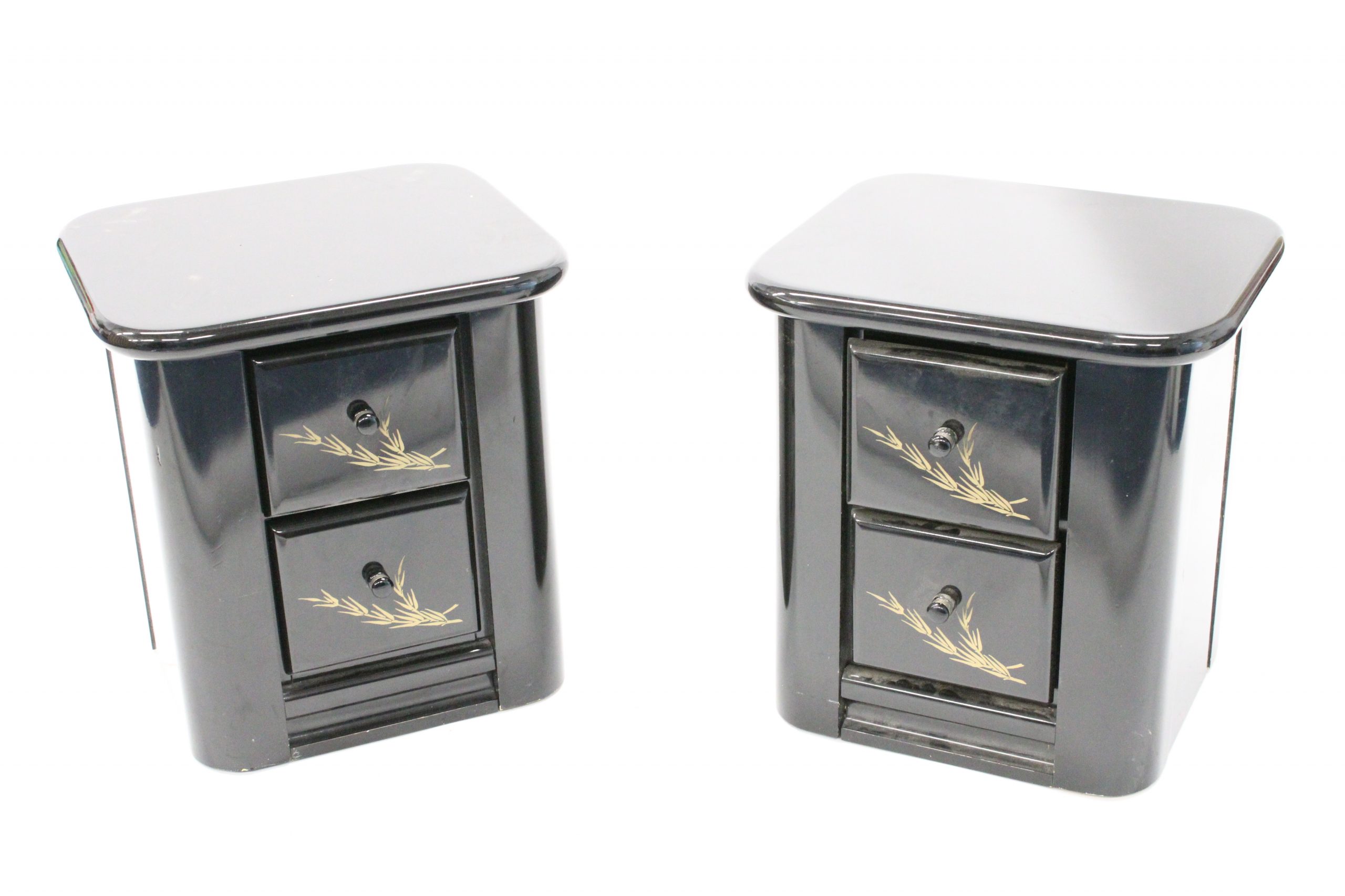 Juego de dos mesitas de noche en color negro con un pequeño dibujo de unas hojas en rorado. También dispone de dos cajones para poder guardar lo que desees. Medias: alto: alto: 47 cm; ancho. 40 cm; fondo: 40 cm.