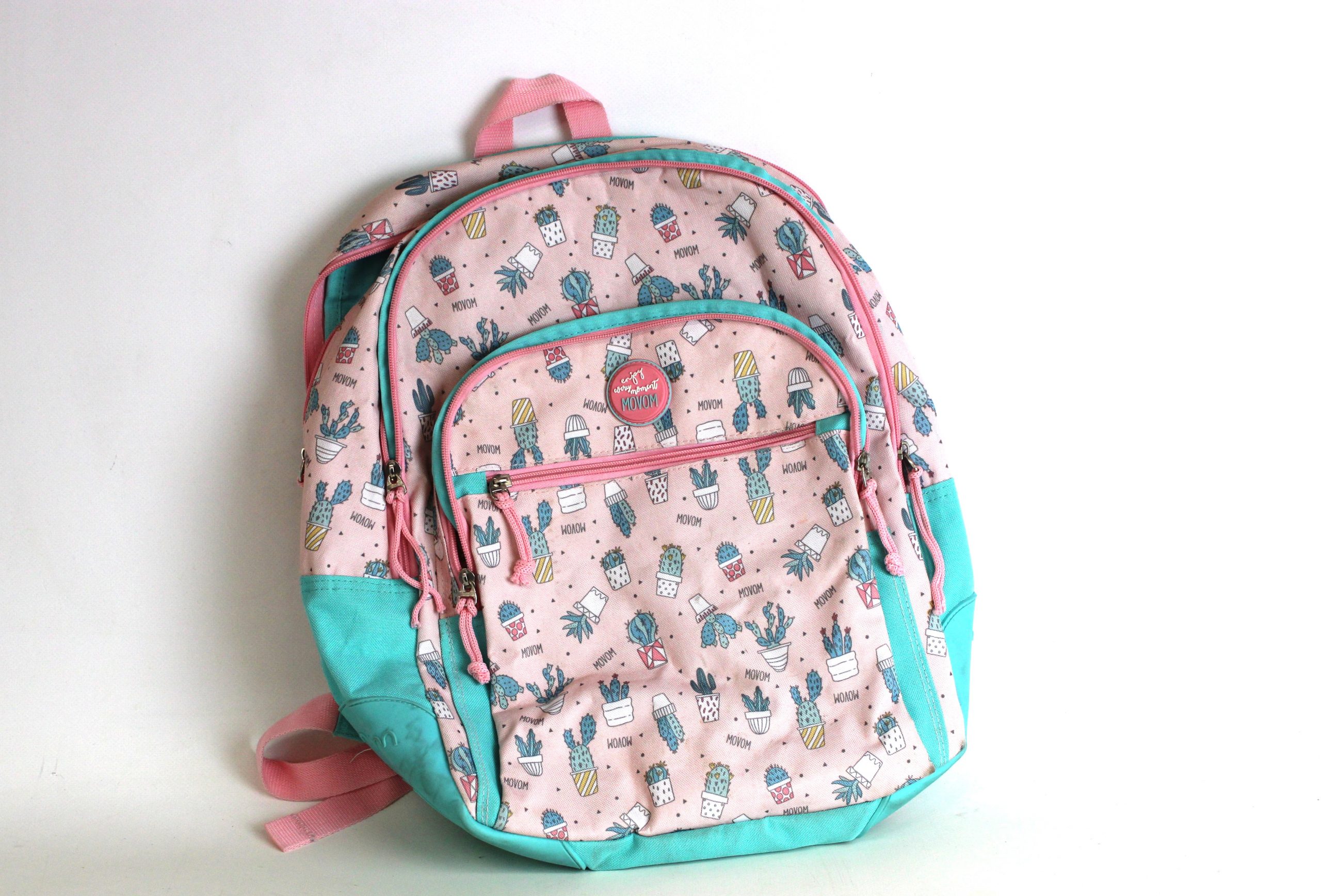 Mochila escolar y casual con estampado completo de varias plantas suculentas y cactus en macetas con detalles en tonos rosas y verde agua