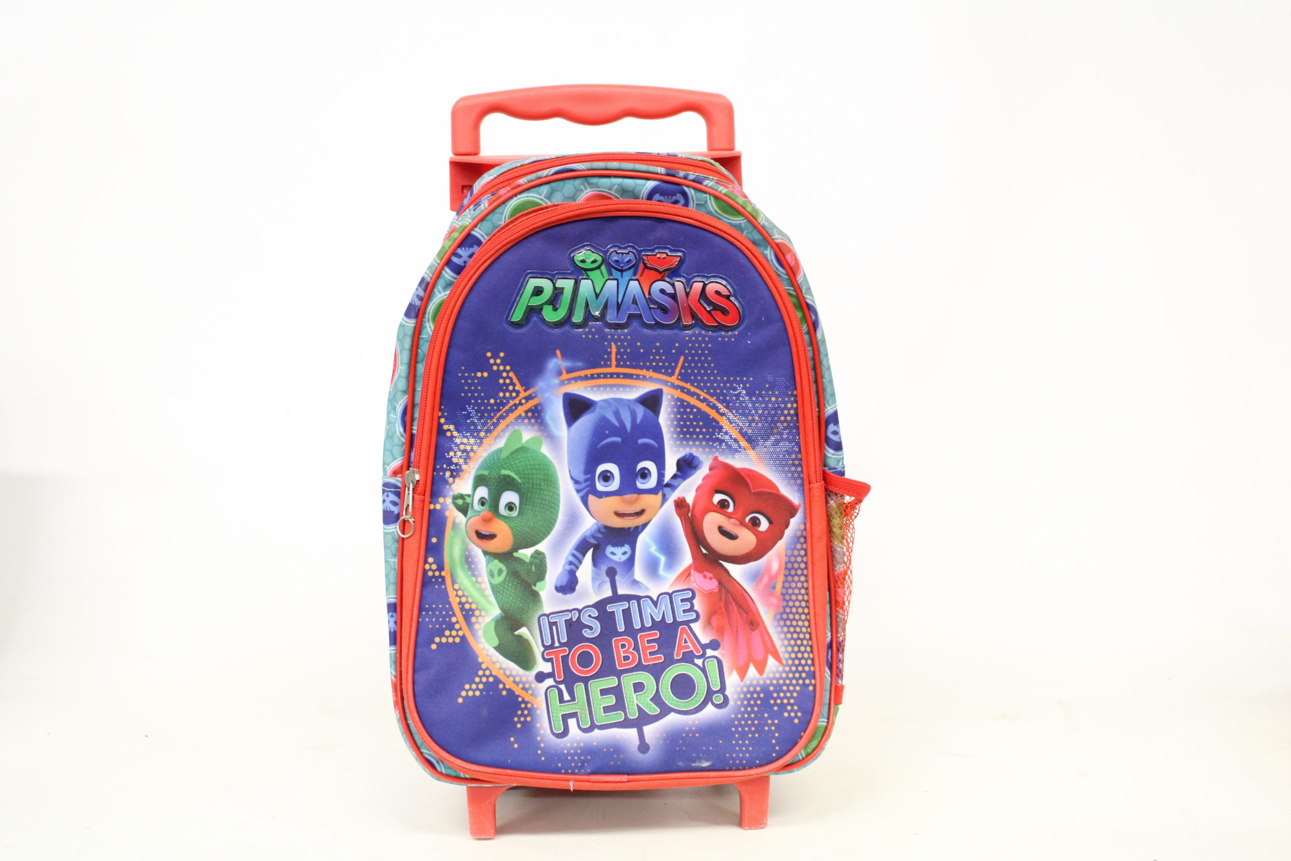 Mochila infantil con imgane de PJ Masks, con ruedas y carrito no extraíble (fijo), cuenta con un compartimento principal, un bolsillo frontal y una una pequeña red lateral para la bebida. Medidas: alto: 37 cm: ancho: 28 cm; fondo: 11 cm.