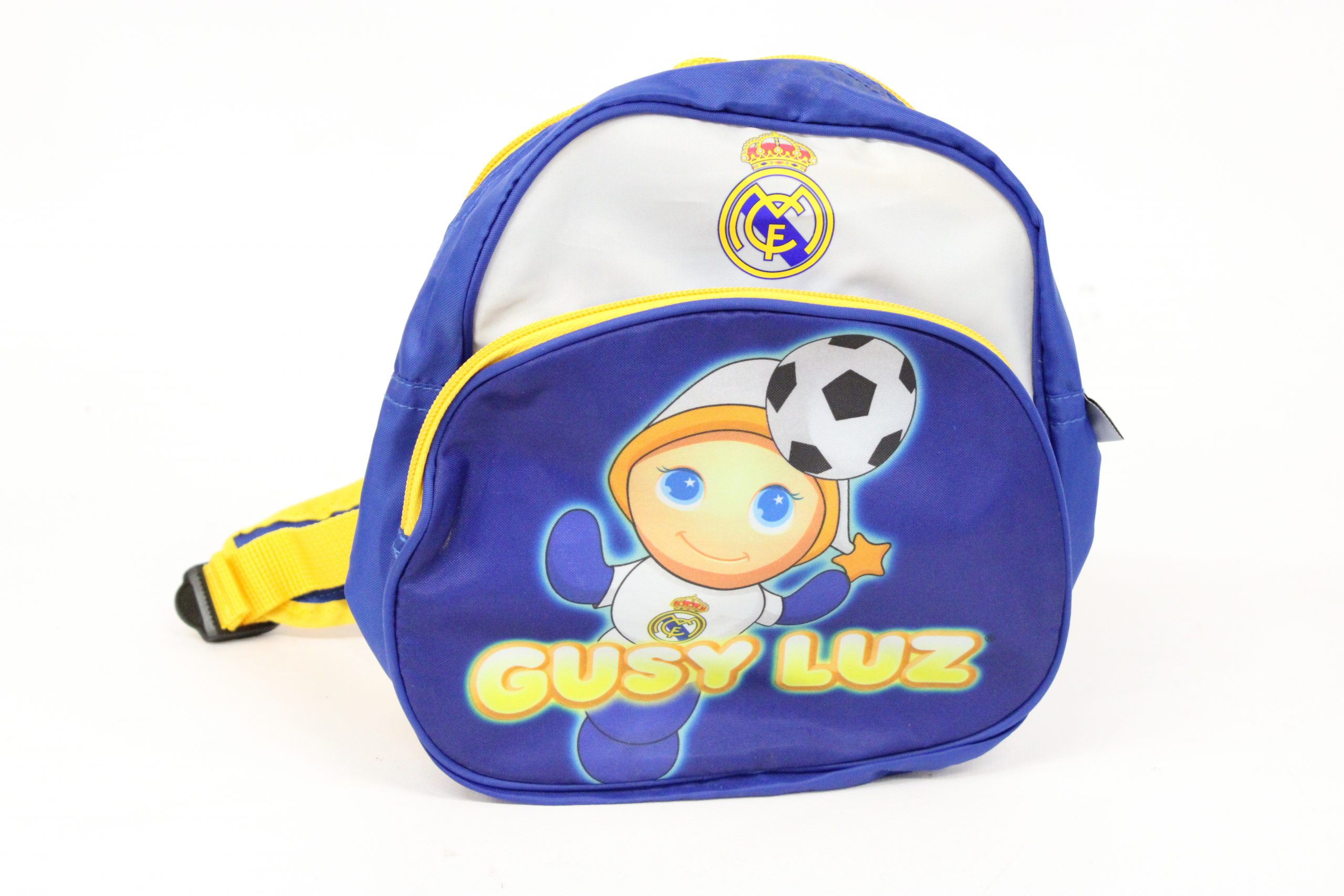 Mochila infantil con licencia oficial del Real Madrid de la marca Molto con dibujo del muñeco Gusy Luz