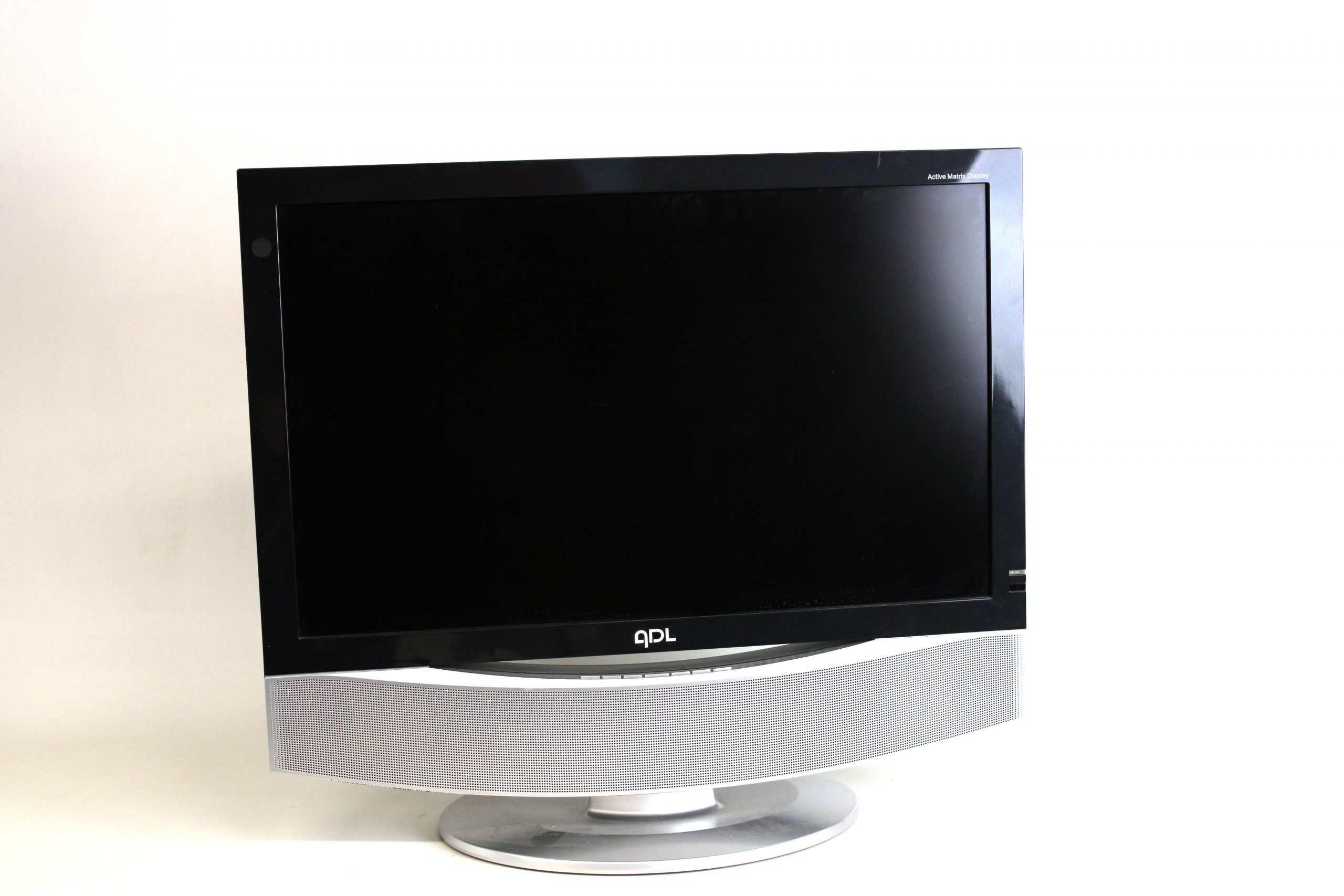 Monitor LCD de la marca QDL, pantalla de lcd de panel plano , soporte de pedestal ovalado , barra de altavoces plateada integrada debajo de la pantall.