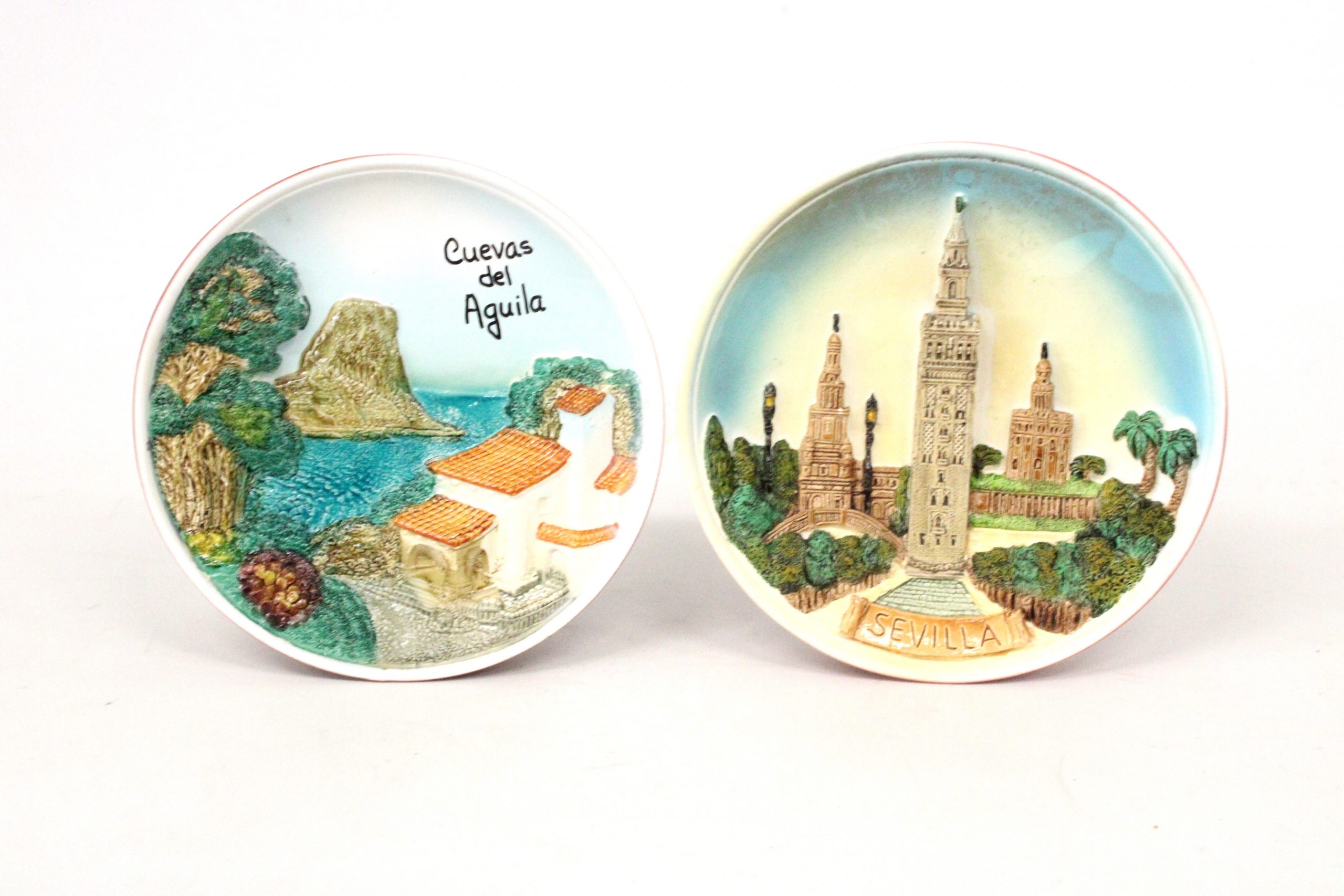 Son platos de cerámica decorativos, que representan las Cuevas del Águila y la Giralda de Sevilla. El plato izquierdo muestra una representación en relieve de las Cuevas del Águila, ubicadas cerca de Ramacastañas, Ávila, España. El plato derecho presenta una representación en relieve de la Giralda de Sevilla, un icónico campanario.