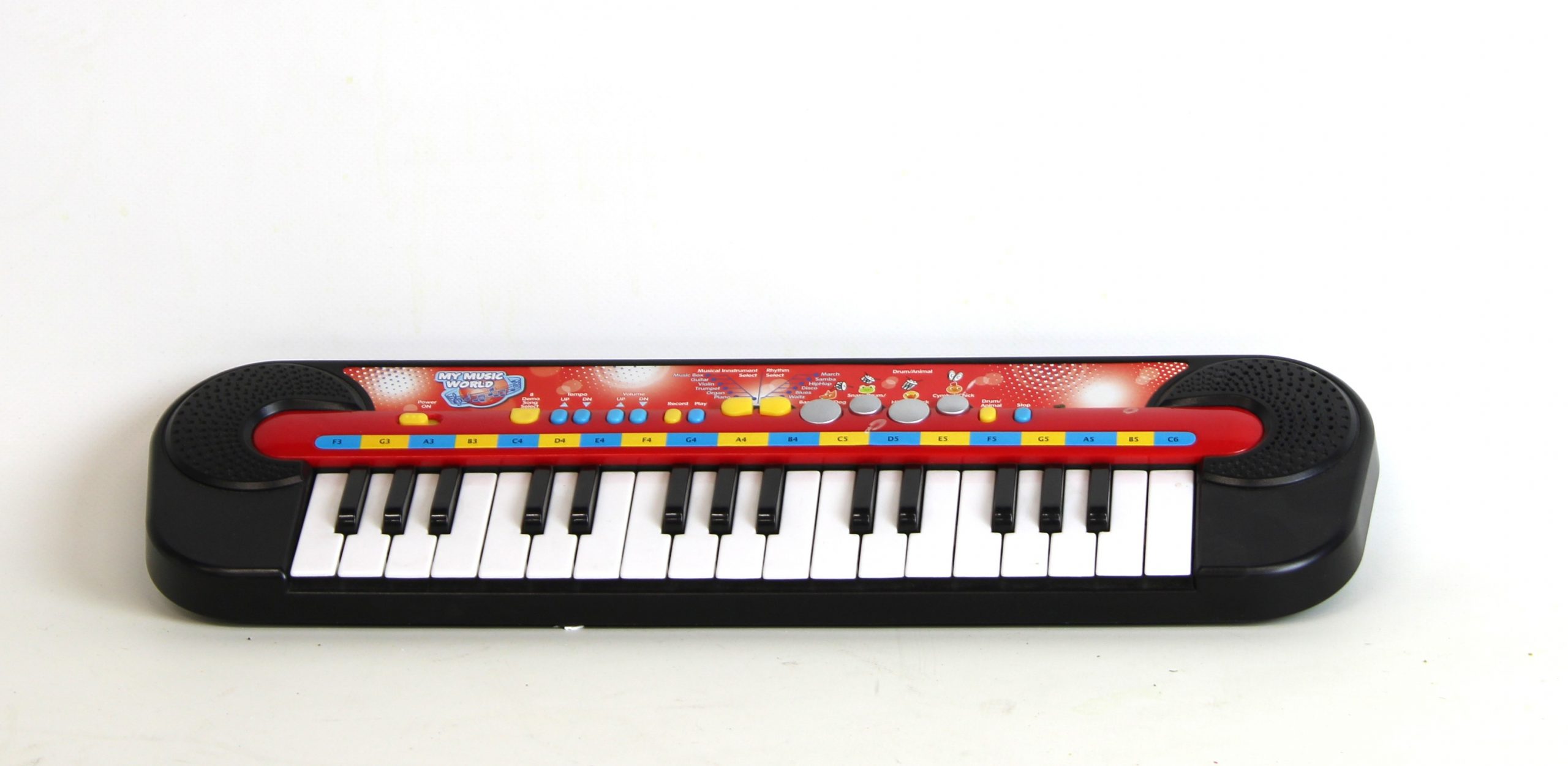 Teclado electrónico de juguete para niños, específicamente el teclado Simba My Music World. Es un teclado midi con 32 teclas. Está diseñado para niños a partir de los 3 años. Tiene un diseño colorido y efectos de luz. Ofrece varias funciones como diferentes ritmos y sonidos de instrumentos.