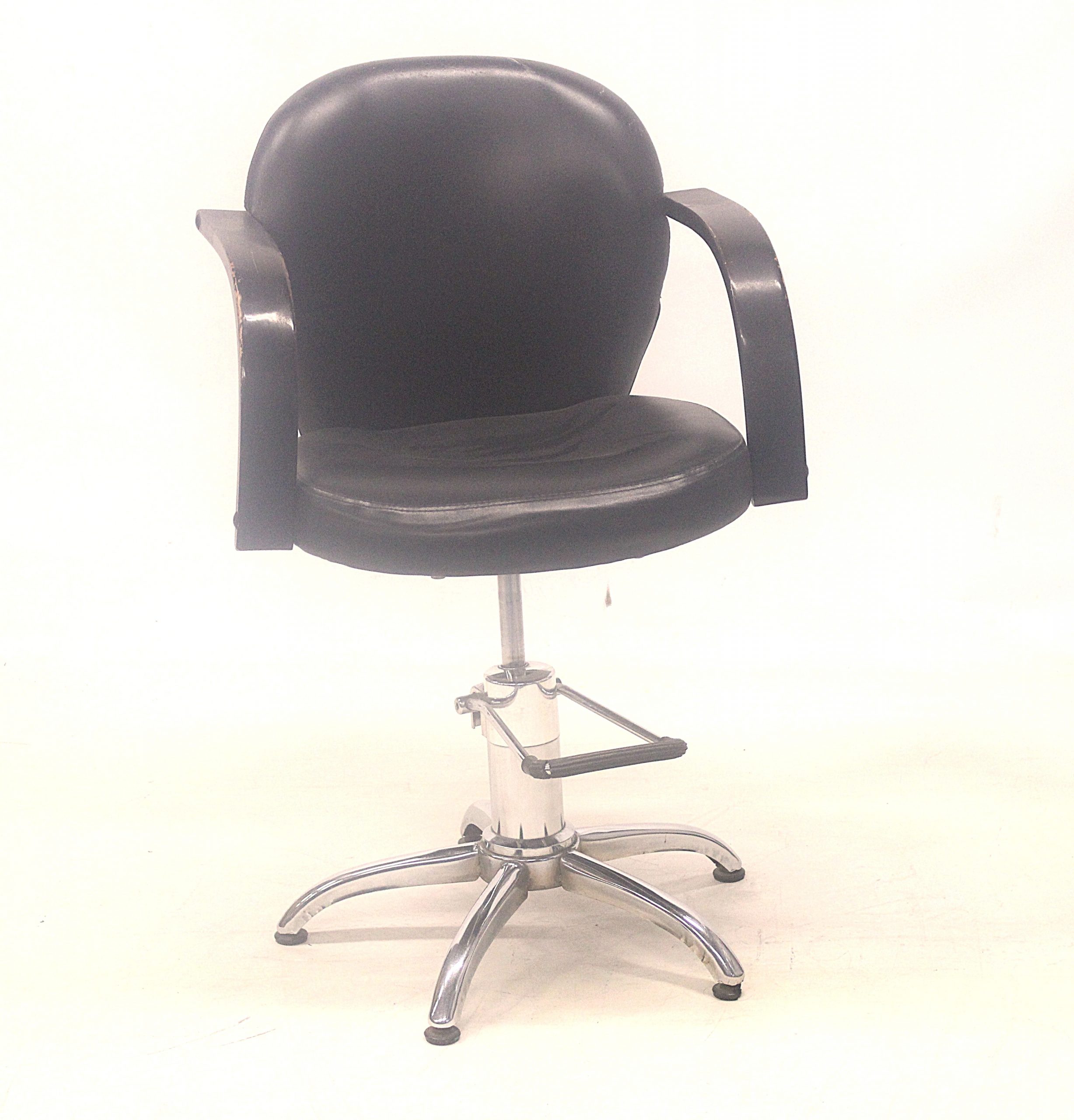 Este es un sillón de peluquería negro con una bomba hidráulica y una base de estrella cromada.