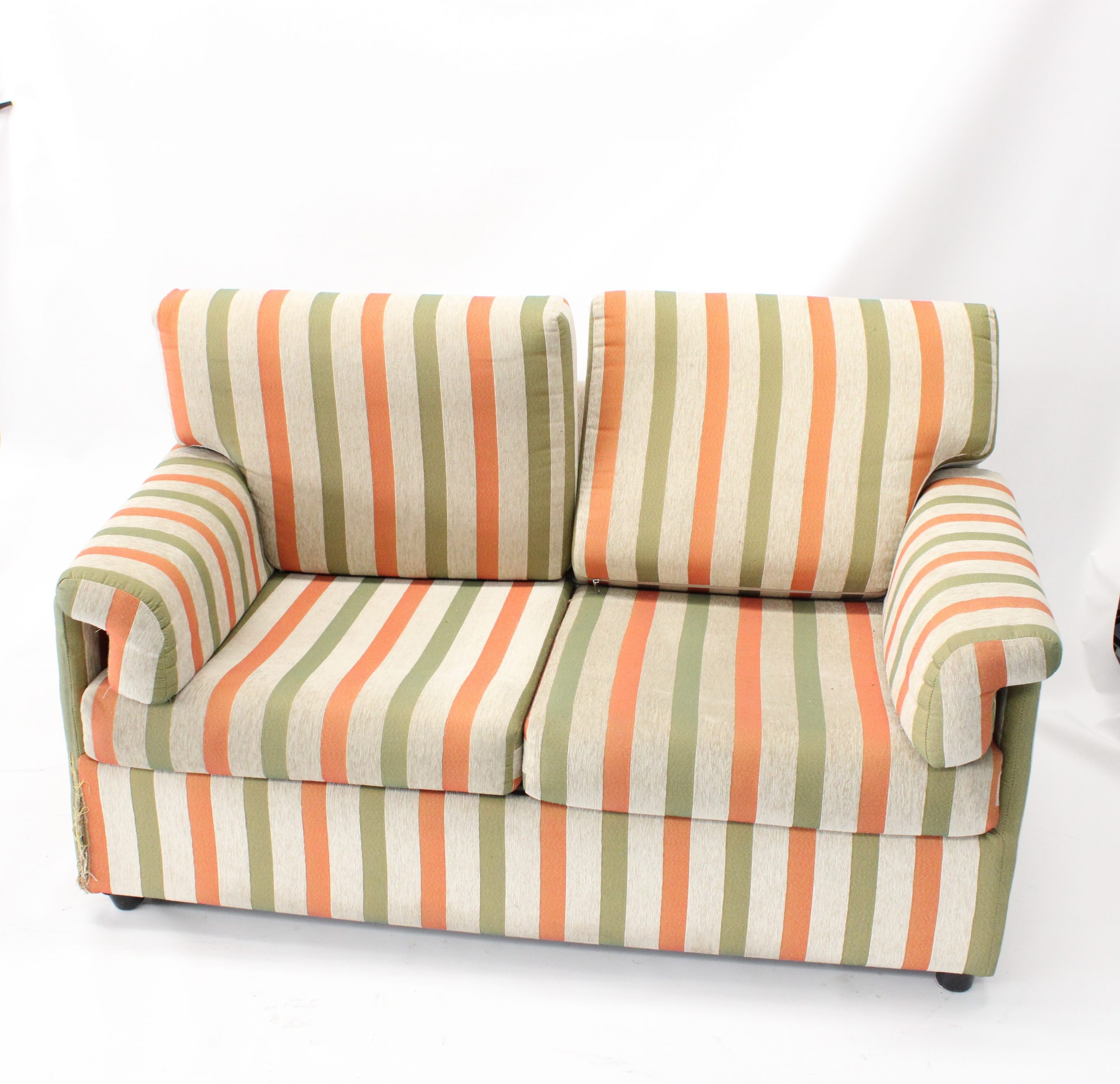 Sofá tapizado con un patrón de rayas de colores. Medidas: alto: 90 cm; fondo: 90 cm; ancho: 140 cm.