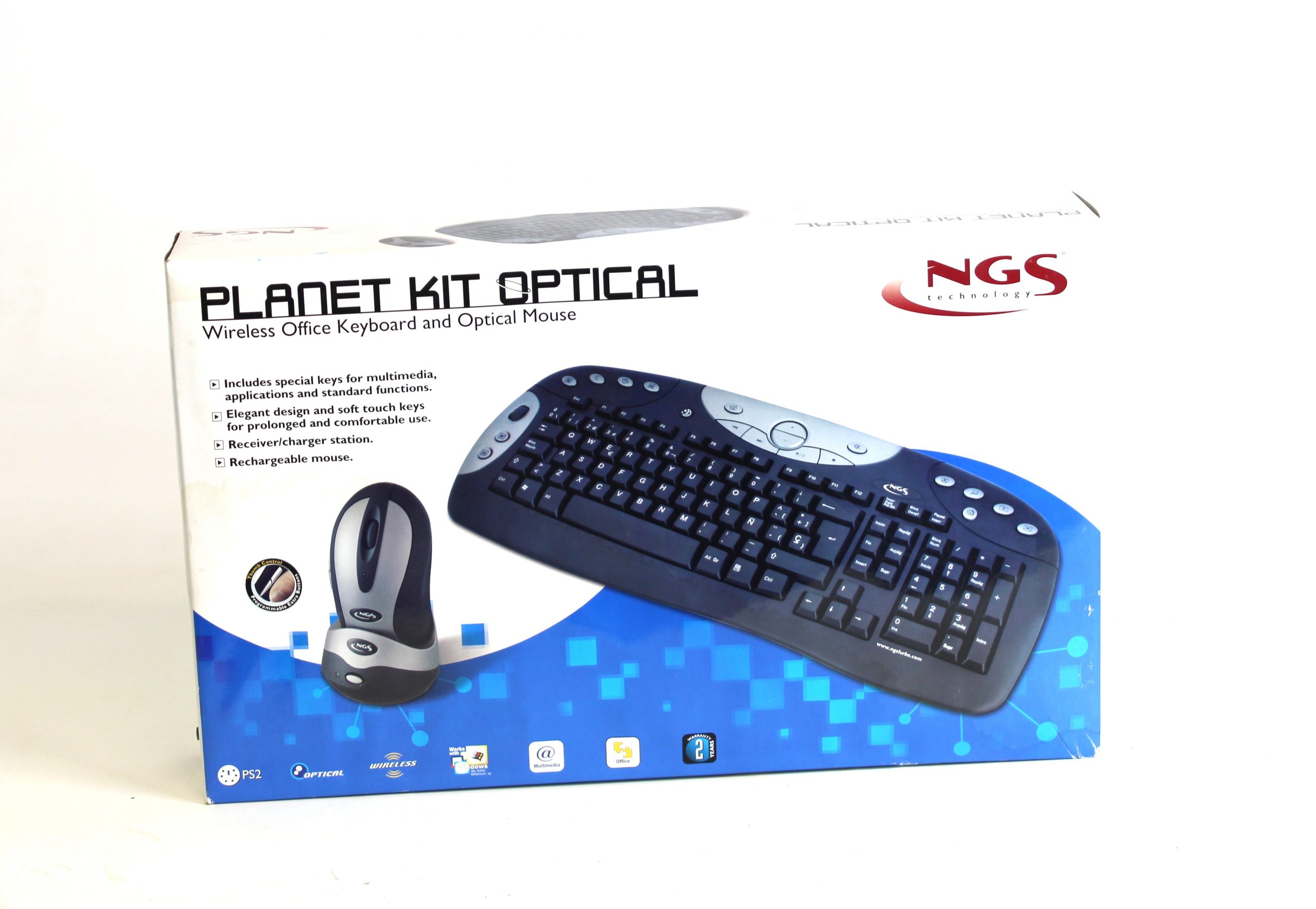 El producto en la imagen es el kit de teclado y ratón inalámbrico NGS Planet Kit Optical. Es un kit de teclado y ratón inalámbrico para oficina. El ratón es óptico. Funciona con tecnología de radiofrecuencia de 2,4 GHz. El teclado tiene un diseño ergonómico. El producto es de la marca NGS.