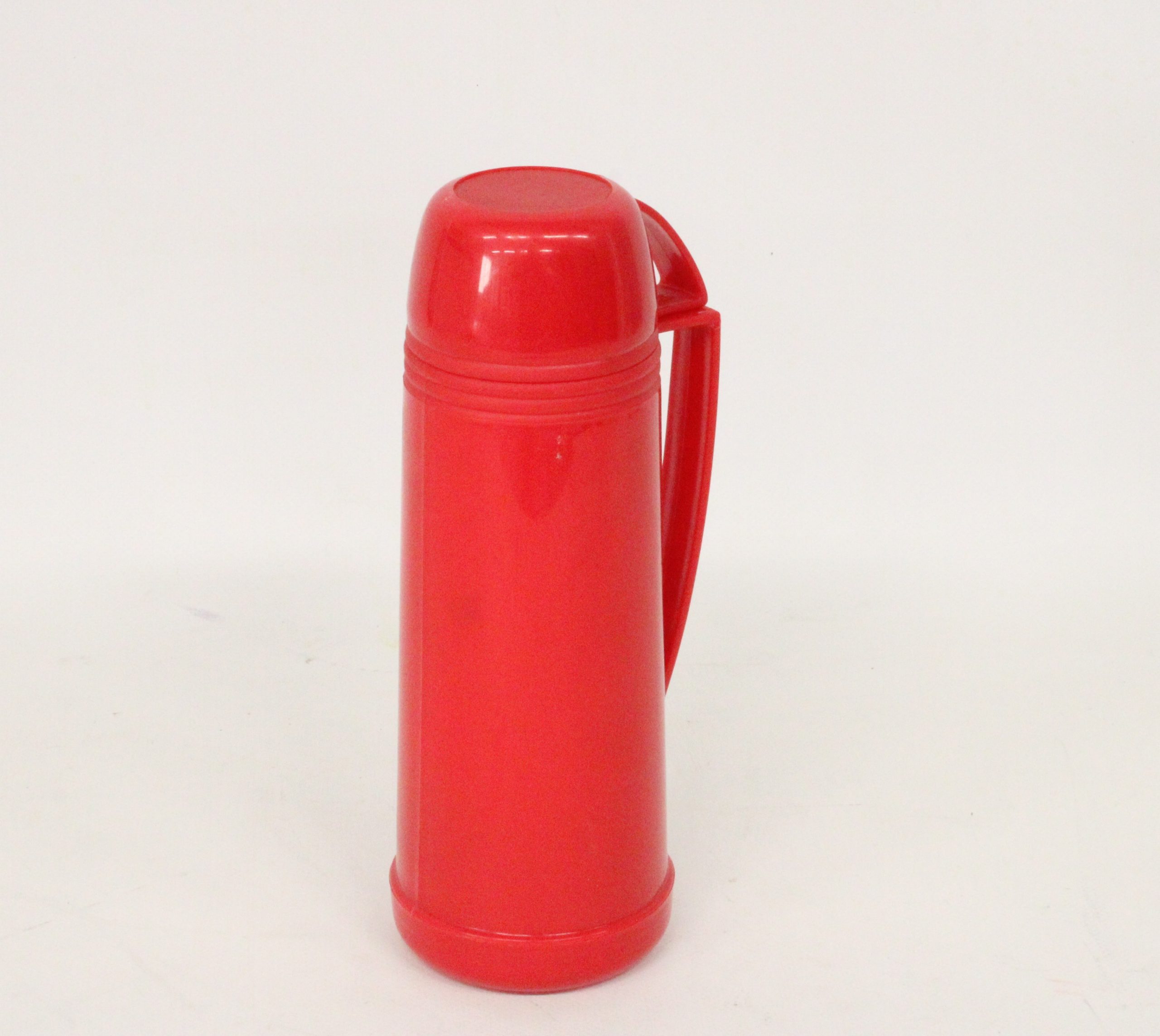 Termo o botella térmica. Diseñado para mantener la temperatura de las bebidas (calientes o frías) durante un período prolongado. Cuenta con una construcción de doble pared y aislamiento al vacío para evitar el intercambio de calor. El material exterior es plástico rojo