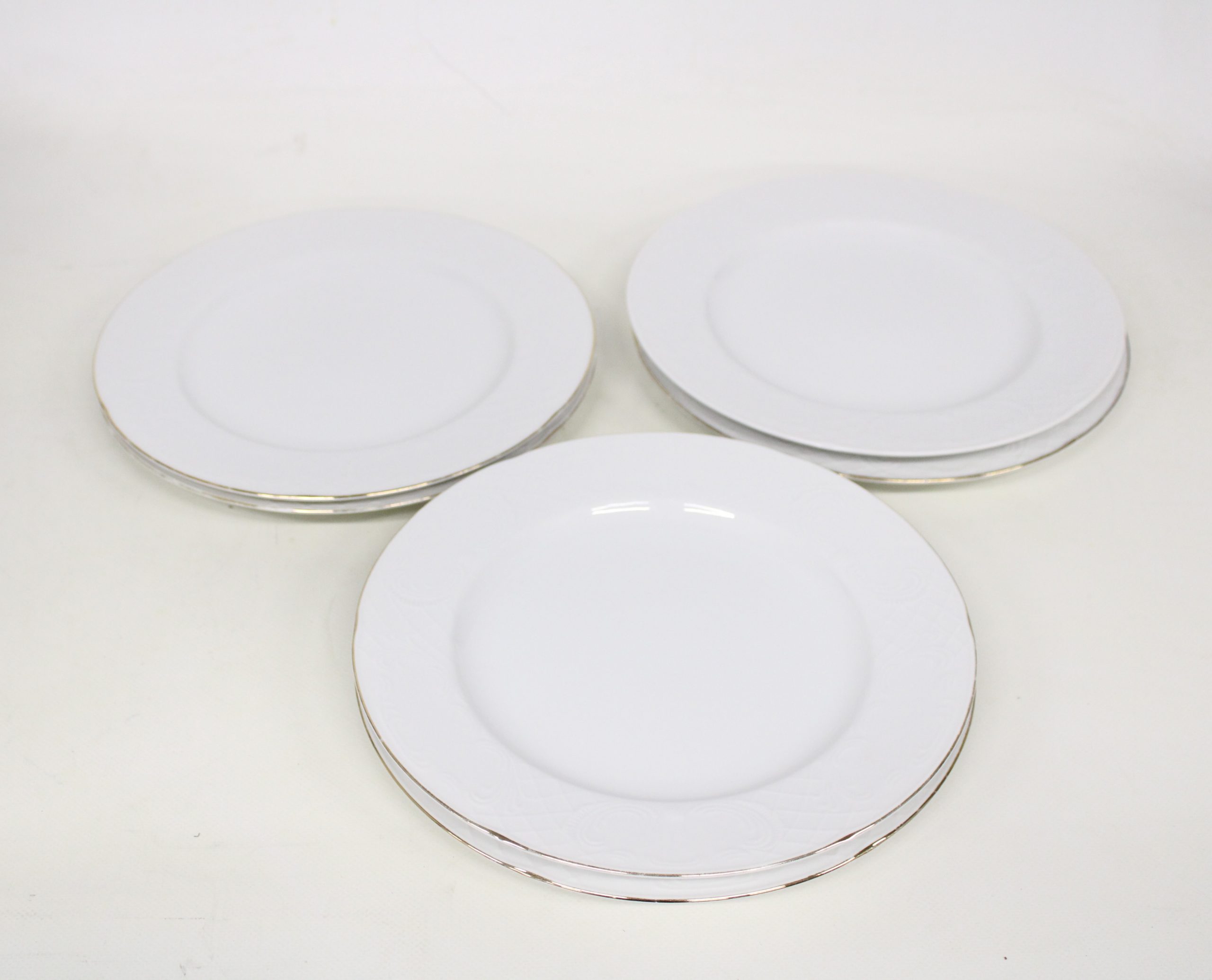 Vajilla de 6 platos llanos, diseñada en porcelana blanca, se compone de un total de 6 piezas: 5 platos llanos con un borde dorado y un plato no tiene el borde dorado.